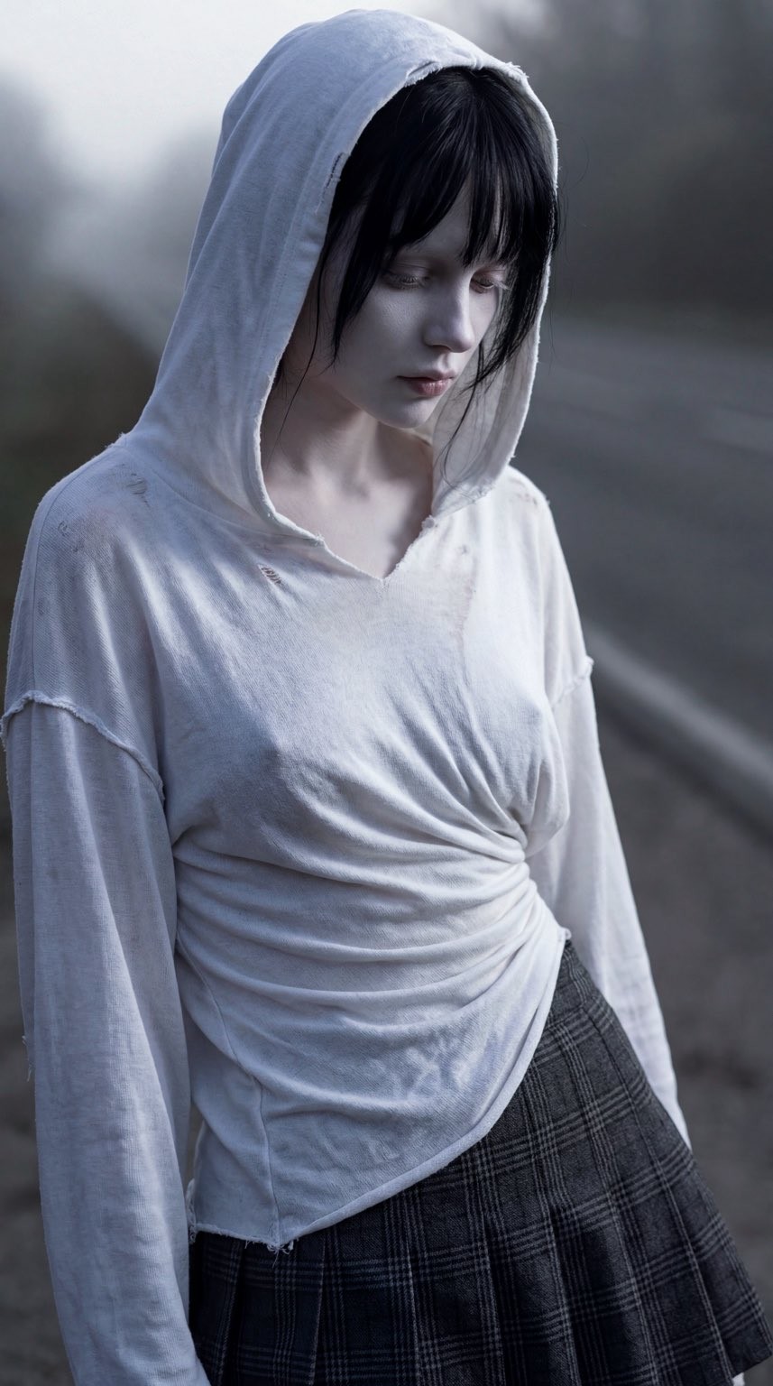 Copy{ "creative_direction": { "concept": "A fine art portrait merging the marble-like precision of Hellenistic 'Wet Drapery' sculpture with the luminous, pale skin tones of a Rubens painting. The focus is a study of tension and translucency where thin, distressed fabric interacts with the human form.", "aesthetic": "High-fashion, melancholic, ethereal yet physically grounded." }, "visual_composition": { "framing": "Vertical 9:16 aspect ratio. An asymmetric, medium-wide shot emphasizing the torso.", "subject": "A model with a doll-like aesthetic, featuring cold-white alabaster skin and deep obsidian-black hair styled with wispy curtain bangs.", "skin_texture": "Hyper-detailed dermis with visible pores and fine vellus hairs. Sub-surface scattering creates a realistic, living-stone glow." }, "material_and_physics": { "upper_garment": "An oversized, off-shoulder white hoodie in heavy-wear jersey cotton. The fabric is thin and distressed to the point of being thread-bare over the chest, becoming semi-translucent where pulled tight.", "lower_garment": "A grey plaid pleated skirt made of heavy wool-blend fabric with crisp vertical pleats.", "physical_interaction": "The hoodie is vacuum-pressed against the anatomy by tension. Every fold and wrinkle defines the underlying shape." }, "lighting_and_optics": { "camera_specs": "Medium format aesthetic (Phase One IQ4), 80mm lens. Extremely shallow depth of field.", "chiaroscuro": "High-contrast lighting. Single primary light rakes across the body at 45 degrees.", "atmosphere": "A hazy-dream overlay." }, "narrative_detail": "The fabric should look at its breaking point. The contrast between cold white skin and rough distressed cotton jersey creates tactile realism." }