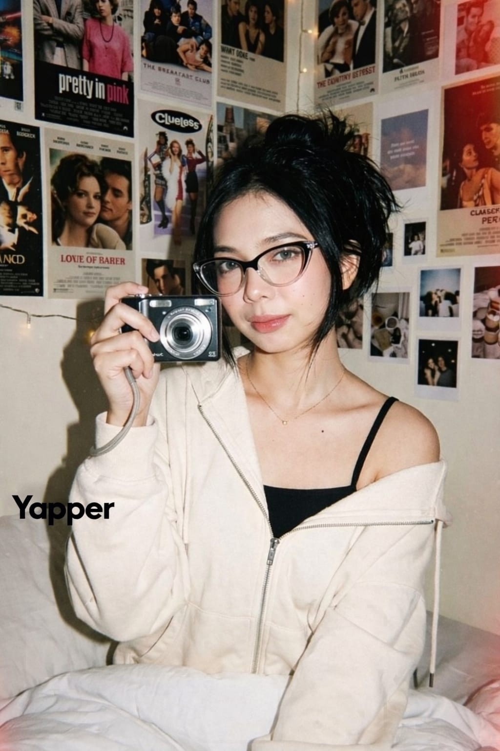 CopyCreate an aesthetic portrait of a young woman in the style of Y2K candid digital camera photography, a cozy, aesthetic room setting similar to Tumblr or Pinterest photos, taken with an old digital camera with a flash to create the signature effect of 2000s digital camera photos. The face must be 100% identical to the original reference face. Do not alter the facial shape, eyes, nose, lips, or facial features. Pose: She sits on the bed, holding a small silver-black camera forward slightly close to her face, as if preparing to take a photo. Her gaze is soft and slightly playful, her head slightly tilted and her shoulders relaxed. She smiles softly at the camera. Makeup: Soft, natural glam makeup with glowing, glass-like skin: flawless foundation, soft pink blush on the cheeks, subtle highlighter on the nose and cheekbones, thin, elongated black eyeliner, long, curly eyelashes, soft shimmering brown eyeshadow, neat, natural eyebrows, and a glossy, rosy pink lip that looks juicy and healthy. Hair: Black hair parted in a messy, fluffy style. Outfit: A black tank top with thin straps, paired with an oversized cream hoodie that zips up to her chest and opens at one shoulder to reveal her black tank top. A pair of thick, casual cream pants (not jogger pants) with no elastic at the bottom. Accessories: Transparent, cat-eye style glasses with black handles. A small gold necklace with a minimalist pendant. Background: Aesthetic bedroom with a white bed sheet, no backrest, and white pillows and bolsters near the wall. The white walls are covered with movie posters and vintage aesthetic posters from the 80s. Lighting: Direct camera flash, like a digital camera photo, provides bright highlights on the face and soft shadows behind. Camera Imperfections: Moderate film grain, slight digital noise, slight chromatic aberration, fine vignette, reddish light leak in the corners of the frame, and slightly soft focus, typical of older digital cameras.