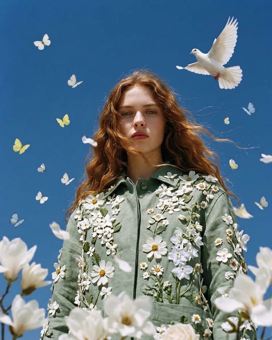 CopyA stunning high-fashion editorial portrait of a young woman with long, wavy auburn hair gently blowing in the wind. She has a calm, serene expression and is wearing a light sage-green linen jacket heavily adorned with intricate, 3D white floral appliques, including daisies and delicate blossoms. The immediate foreground features large, slightly out-of-focus white flowers to create cinematic depth of field. Surrounding her in the air is a surreal, magical flurry of white doves in mid-flight, loose floating petals, and delicate butterflies in soft shades of yellow, blue, and white. The background is a perfectly clear, vibrant blue sky. Shot in bright, crisp natural daylight with an ethereal, dreamlike, and cinematic art style.