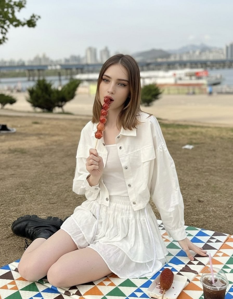 Copykorean street fashion aesthetic, dreamy spring picnic scene by the Han River in Seoul, pretty caucasian girl in her early 20s with soft shoulder-length chestnut brown hair, natural loose waves slightly moving in riverside breeze, glowing fair skin with dewy makeup, subtle peach blush, glossy lips, soft brown eyeliner, straight brows, calm dreamy expression looking slightly off camera, relaxed candid vibe, sitting cross-legged on a colorful pastel picnic mat near the riverside park, wearing oversized white vintage denim jacket layered over fitted white ribbed tank top, flowy white tiered chiffon mini skirt catching the wind, chunky black leather platform boots with visible texture, minimal silver jewelry, delicate necklace and small hoop earrings holding glossy tomato-coated korean rice cake skewer (tteok) in one hand and crispy korean corn dog dusted lightly with sugar in the other, clear plastic cup of iced americano beside her with visible ice cubes and condensation droplets reflecting golden sunlight background features soft bokeh Seoul city skyline, Han River bridge stretching across the frame, distant layered blue-gray mountains, fresh green grass and spring trees, warm spring-summer atmosphere, golden hour lighting with soft rim light outlining her hair, subtle cinematic lens flare, airy pastel color grading, warm highlights and soft shadows fujifilm superia 400 film look, fine natural film grain, high dynamic range, creamy shallow depth of field, sharp focus on subject, highly detailed textures, 85mm lens, f/1.8, professional editorial portrait photography, lifestyle street fashion magazine vibe, natural candid composition, photorealistic, ultra detailed, 8k resolution --ar 2:3 --v 6 --style raw --s 250 --q 2