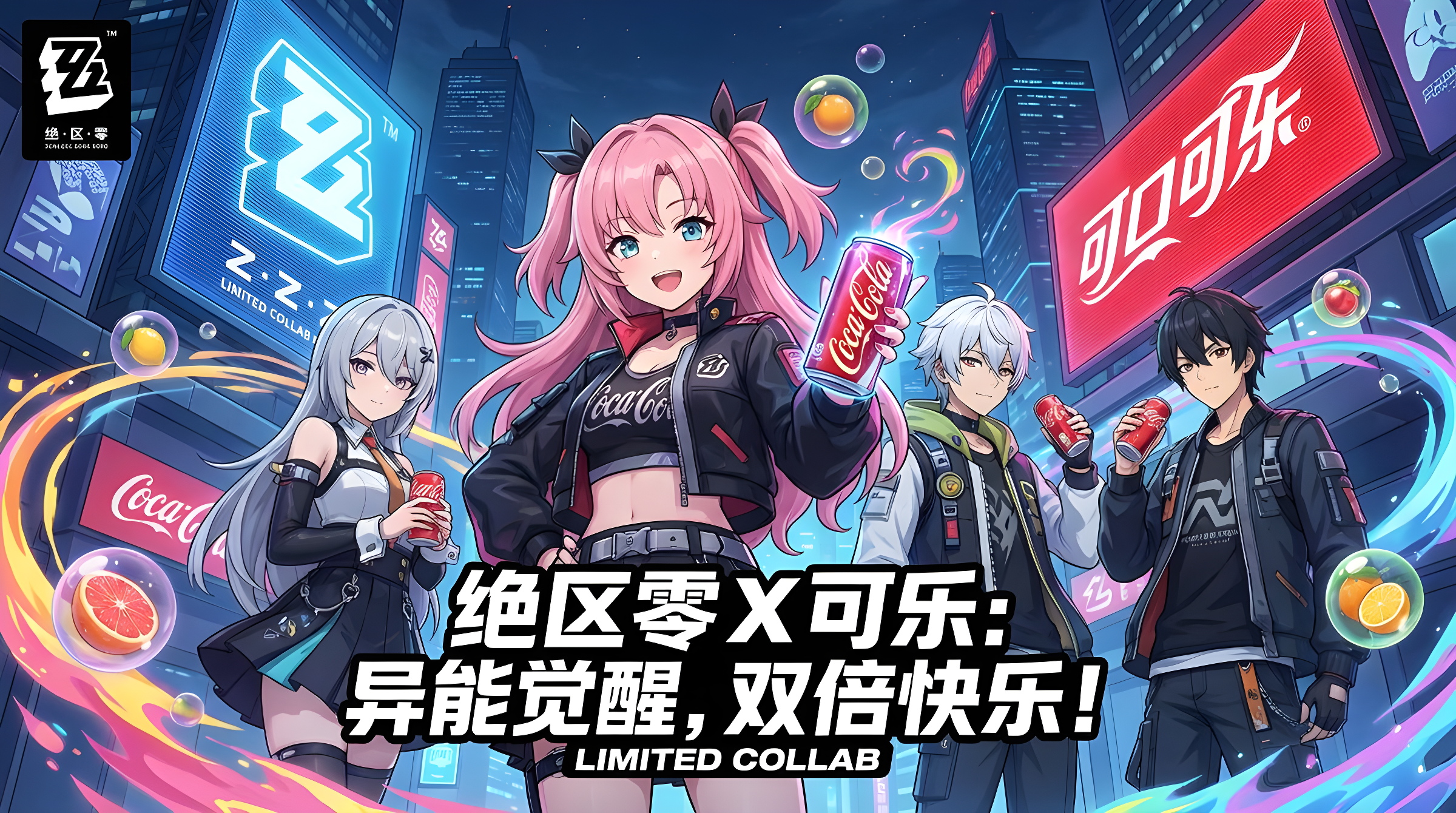 CopyAspect ratio 16:9, official game collaboration poster, masterpiece, vibrant ZZZ anime style. Scene: Four fashionable anime characters (a pink-haired girl in a black jacket as the visual center, a silver-haired girl, a white-haired boy, and a black-haired boy) posing on a futuristic city night street, each holding a glass of Coca-Cola. Environment: A nighttime street in a futuristic city, dominated by massive, glowing neon signs. A large, unmissable neon sign featuring a stylized "ZZZ" logo serves as the absolute visual focal point in the background, shining brightly behind the main characters. Other neon signs reading "Coca-Cola" are equally prominent, bathing the entire scene in vivid purple and blue light. Special Effects: Strawberries, lemons, and other fruits encased in transparent bubbles float around, with glowing pink and blue energy swirls flowing through the composition. Text Elements: Top Left: Logos for "ZZZ" and "Coca-Cola" connected by an "X". Bottom Center: A large, eye-catching Chinese text: "ZZZ X Coca-Cola: Awakened Power, Double the Joy!" in bold, stylized artistic font, white-filled with a thick purple-pink gradient outline. Below the Chinese text: A black rectangular box with white uppercase English text: "LIMITED COLLAB". Art Style: Highly detailed, clean lines, cinematic lighting effects from the giant neon signs, dynamic composition. Negative Prompts: Blurry, low quality, distorted anatomy, deformed hands, ugly, watermarks, signatures, garbled text, distorted letters.