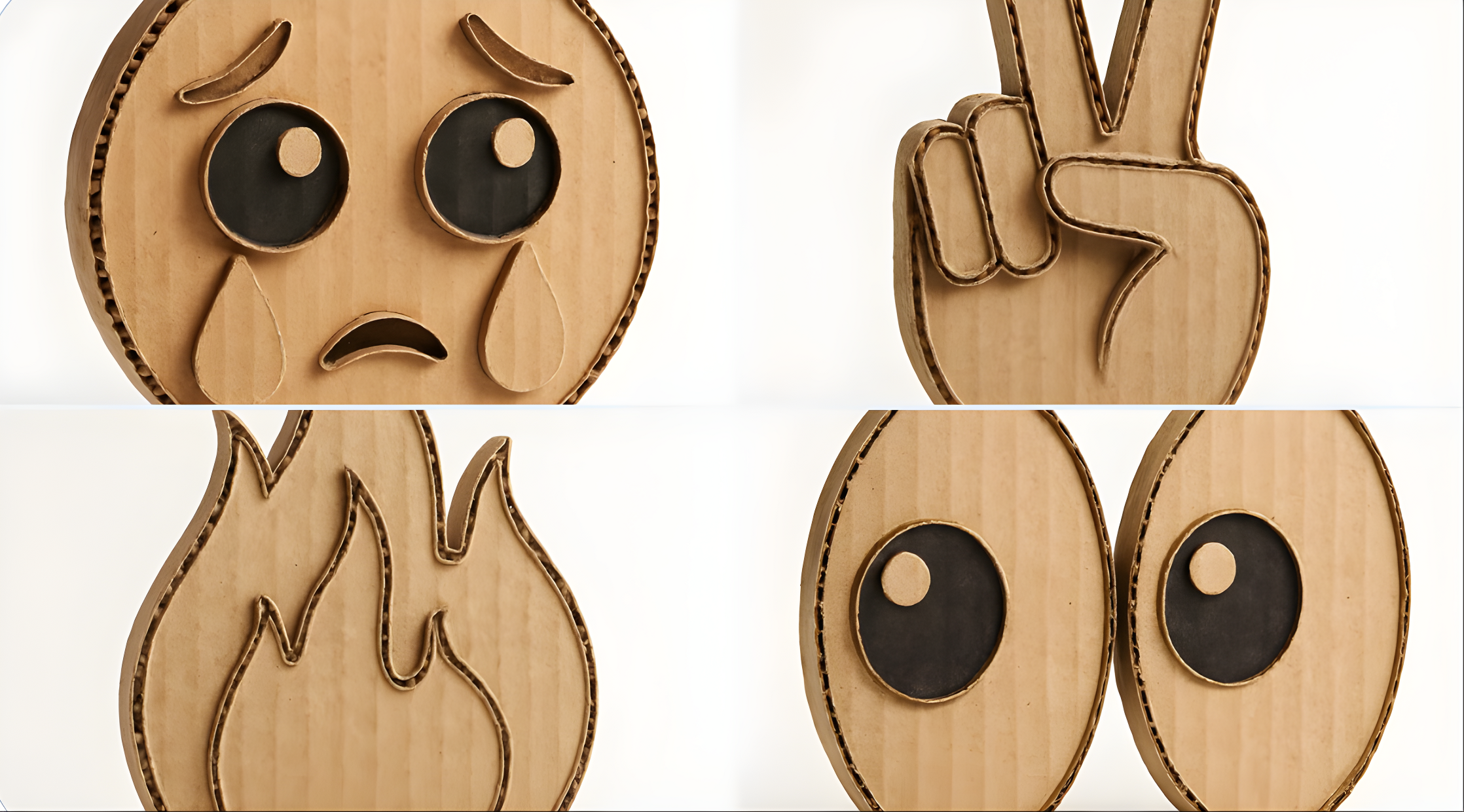 CopyUltra high-resolution 3D render of the emoji [🥹], meticulously recreated as a realistic cardboard sculpture. The object is crafted from corrugated brown cardboard, featuring clearly defined fluted edges, visible layering, and rough kraft paper textures. Close-up studio