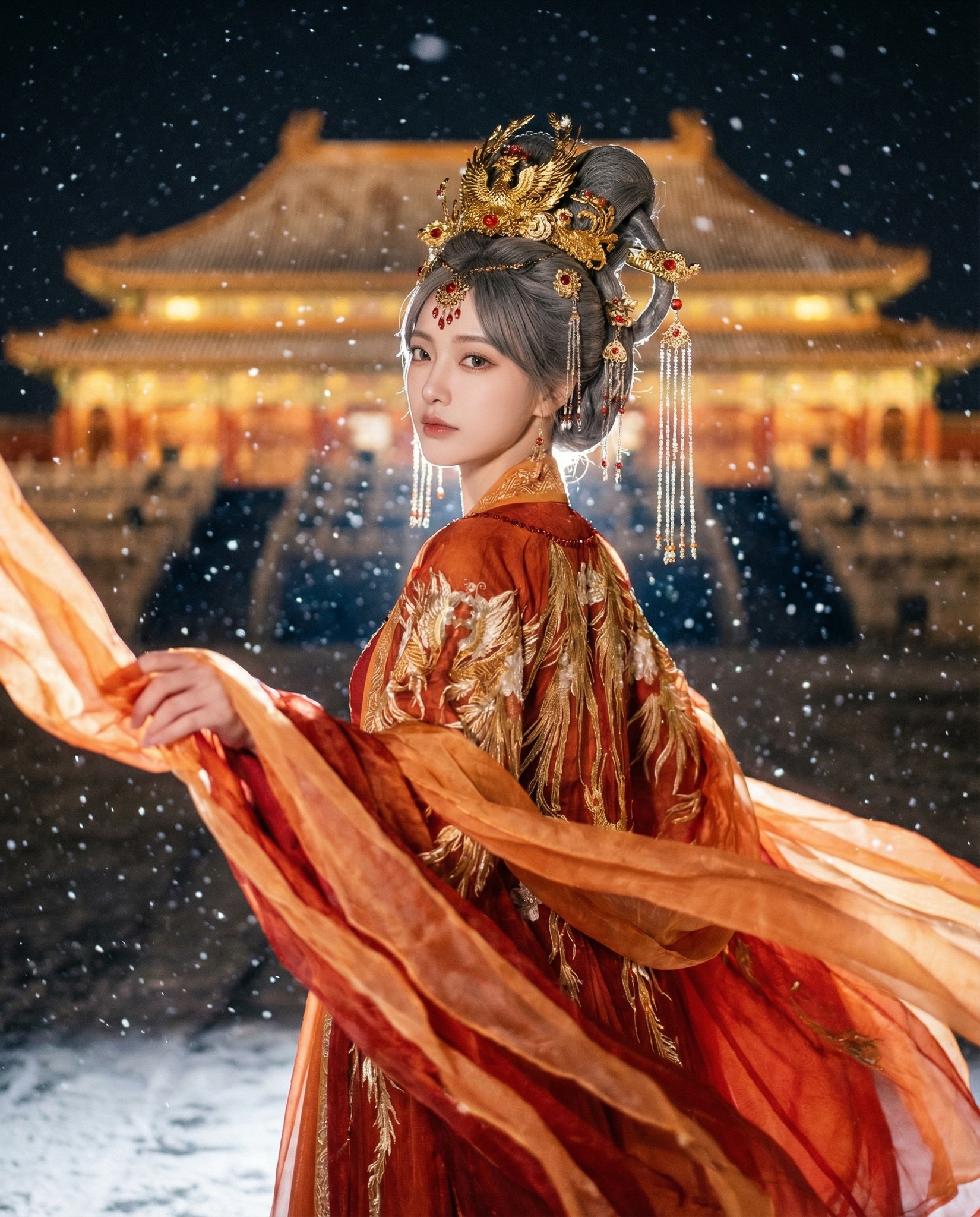Copy{ "portrait_prompt": { "subject": "A woman dressed in elaborate traditional Chinese costume. The subject wears an incredibly elaborate and grand traditional high bun hairstyle adorned with an oversized golden phoenix crown, numerous intricate hairpins, cascading red jewels, and long, shimmering dangling tassels. She is posed in a 3/4 rear view, turning her head back to look over her shoulder at the viewer with an elegant, ethereal expression. Her hand holds a long, translucent orange silk ribbon or sleeve that flows toward the camera lens, creating a sense of movement.", "composition": "Close-up shot, estimated 85mm focal length at f/1.2, bokeh background. The composition deliberately aligns the subject with the background to create a visual echo between her costume and the Forbidden City architecture. Foreground includes out-of-focus flowing fabric and falling snow to add depth. Rule of thirds applied to the subject's face.", "camera_angle": "Eye-level, slightly angled to capture the rotation of the body.", "lighting": "Nighttime snowy scene. Dominant backlight provided by the massive, glowing Forbidden City architecture which creates a rim light and halo effect. Flash lighting illuminates the subject's face from the front-left to ensure clear skin tones against the dark background.", "color_palette": "Fujifilm color, film-like, rich and vibrant. Dominant tones of Crimson Red, Burnt Orange, and Gold, contrasted with the white of the falling snow and the deep black of the night sky. High saturation, festive atmosphere.", "mood": "Majestic, mythical, and ethereal. Captures the essence of a traditional lantern festival in the Forbidden City during a snowfall with a fantasy aesthetic. The connection between the 'human phoenix' and the 'spirit of the palace' is the central narrative.", "negative_prompt": "Unrealistic features, anatomical errors, stiff pose, over-processed, harsh lighting, blurry face, low resolution, bad composition, distorted hands, extra fingers, missing limbs, watermark, text, modern clothing, daylight" } }