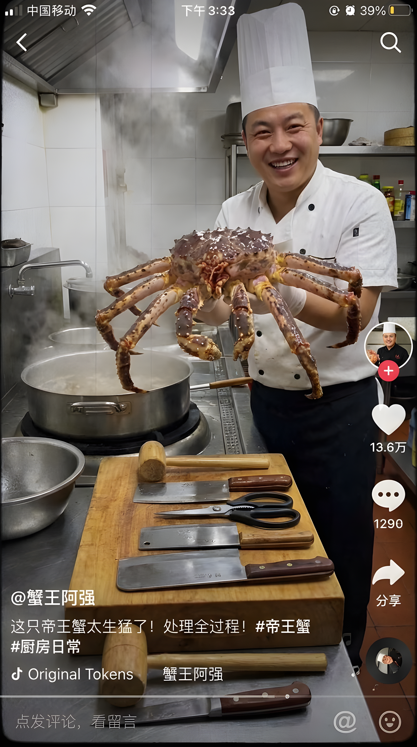 CopyGenerate a vertical TikTok short video screenshot featuring a king crab being prepared in a kitchen, with the chef facing the camera to showcase the ingredients and a complete set of kitchen tools on the cutting board.