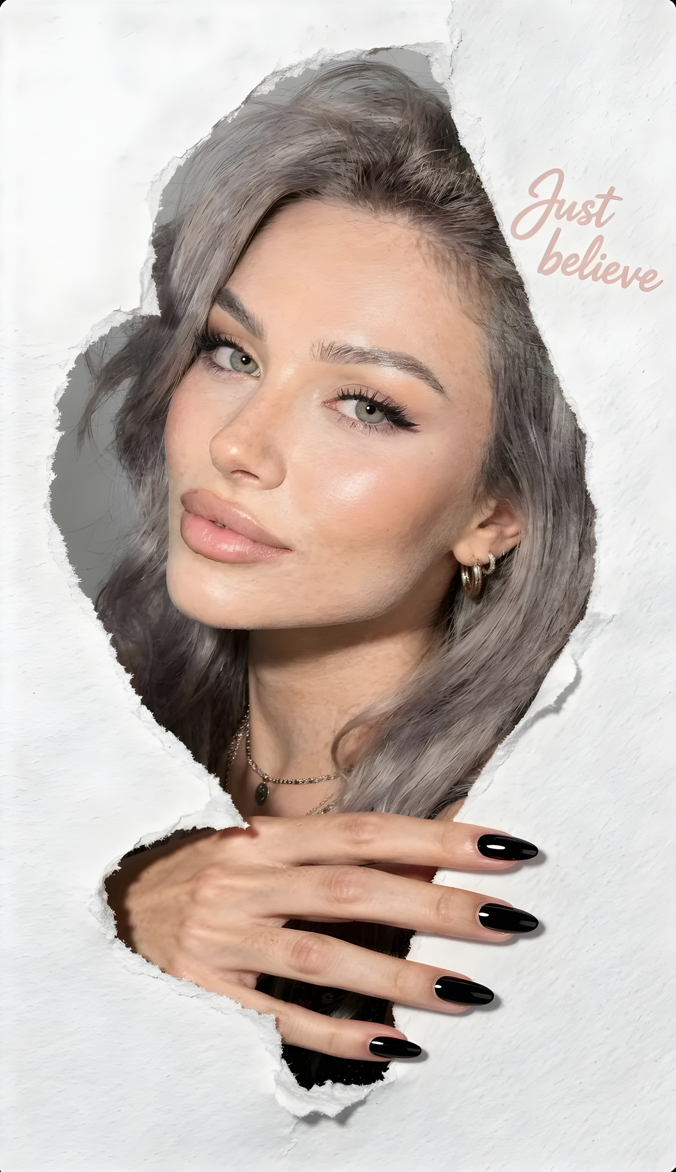 CopyUltra-realistic 8K HD portrait, aspect ratio 3:4, professional studio photography quality. Use face reference — preserve facial identity 100%, no face changes. Concept & Composition: Close-up intimate portrait with a peek-through / torn paper heart-shaped opening as the main focal point. The torn paper effect is realistic, slightly rough edges, subtle paper fibers visible. One hand emerges naturally through the tear, creating a convincing 3D depth effect. Minimalist pure white background,clean and distraction-free, fully centered composition. Handwritten text "Just believe" placed at the top right near the heart curve, soft handwritten font, pale pink, subtle and elegant. Face & Skin: Doll-like facial features with very fair porcelain skin, realistic skin texture visible (natural pores, micro-imperfections, soft tonal transitions). Skin looks luminous but not plastic. Expression calm, gentle, slightly dreamy, strong eye focus toward the camera. Makeup (Douyin style, realistic): Clean Douyin makeup look — sharp yet soft eyeliner with a slight cat-eye lift, curled upper and lower lashes, soft pink blush on cheeks and nose bridge, thin natural brows with a soft rosy undertone, glossy soft-pink lips. Eye color appears soft pink (contact lens effect), subtle and believable. Hair (no color mention): Long, naturally wavy hair framing the face softly, realistic strands and volume, no visible styling products. Hand Details: Hand emerging through torn paper, natural pose. Nails with transparent black gradient, glossy finish, adding a subtle edgy contrast. No clothing visible — framing remains face, hand, and paper only. Lighting: Front-facing professional studio lighting, crisp and direct, creating defined yet clean shadows, high clarity on facial features and texture without overexposure. Camera & Realism: Shot on a professional full-frame camera, portrait lens look (≈50–85mm), shallow depth of field, sharp focus on eyes, cinematic clarity, true-to-life proportions, no distortion. NEGATIVE PROMPT cartoon, anime, illustration, CGI, plastic skin, over-smoothed face, beauty filter, exaggerated eyes, warped anatomy, asymmetrical face, bad hands, extra fingers, deformed nails, harsh HDR, color banding, flat lighting, low resolution, blur, noise, watermark, logo, text artifacts, clothing visible