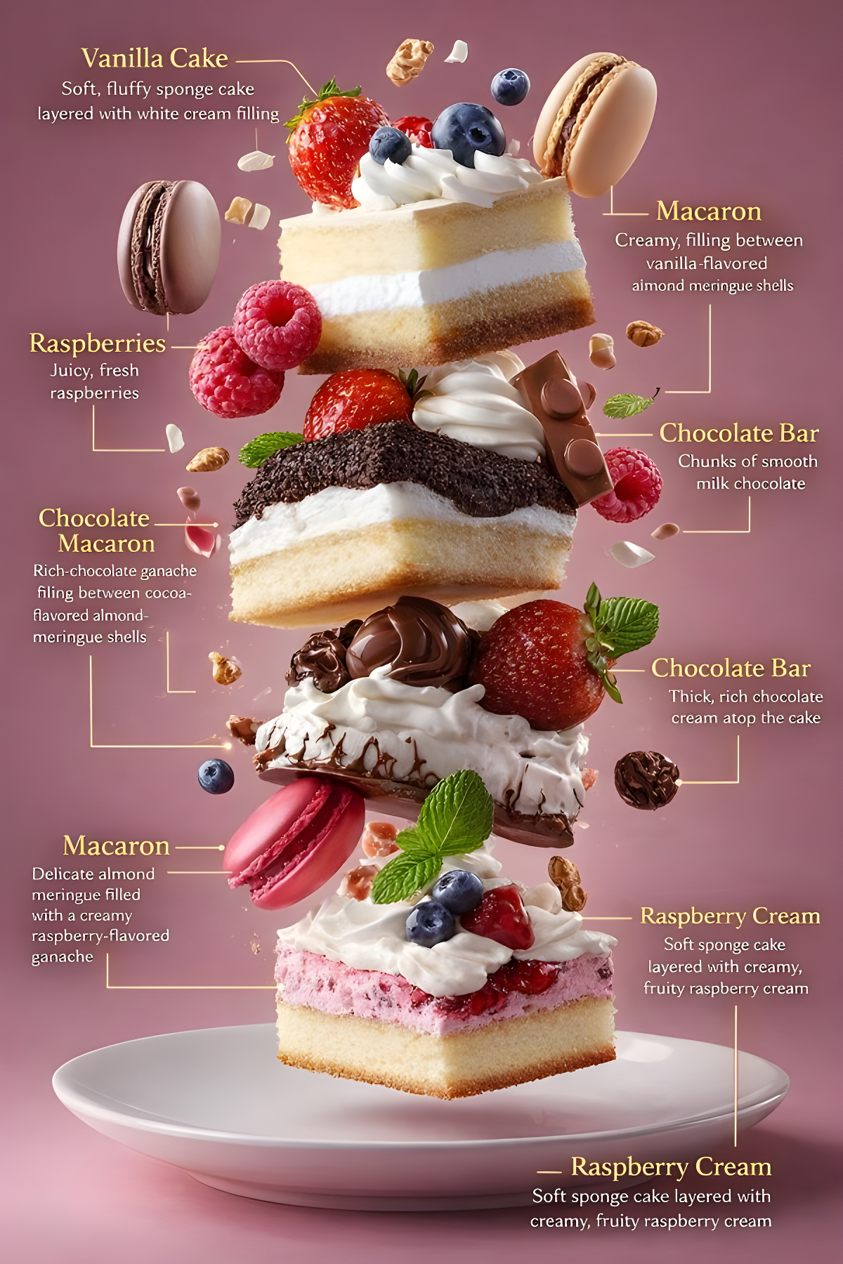 Copy{"global_settings":{"resolution":"8K ultra high definition","aspect_ratio":"3:4","camera_style":"studio food photography with cinematic lighting","depth_of_field":"shallow depth of field, sharp subject, soft background","lighting":"soft directional key light, subtle rim light, controlled highlights","style":"hyper-realistic food illustration with editorial infographic overlays","text_design":{"ingredient_name_color":"metallic gold","ingredient_description_color":"pure white","indicator_lines":"long, thin, smooth golden lines with rounded corners"}},"scene_description":"A vertical stack of assorted cake slices floating above a white ceramic plate against a soft pink gradient background.","main_subjects":["multiple layered sponge cake slices","white whipped cream layers","raspberry cream layer","chocolate cream topping"],"visible_ingredients":["vanilla sponge cake","whipped cream","raspberries","blueberries","strawberries","macarons","chocolate bar pieces","mint leaves"],"motion_elements":["floating fruits","floating macarons","crumbs suspended in air"]}