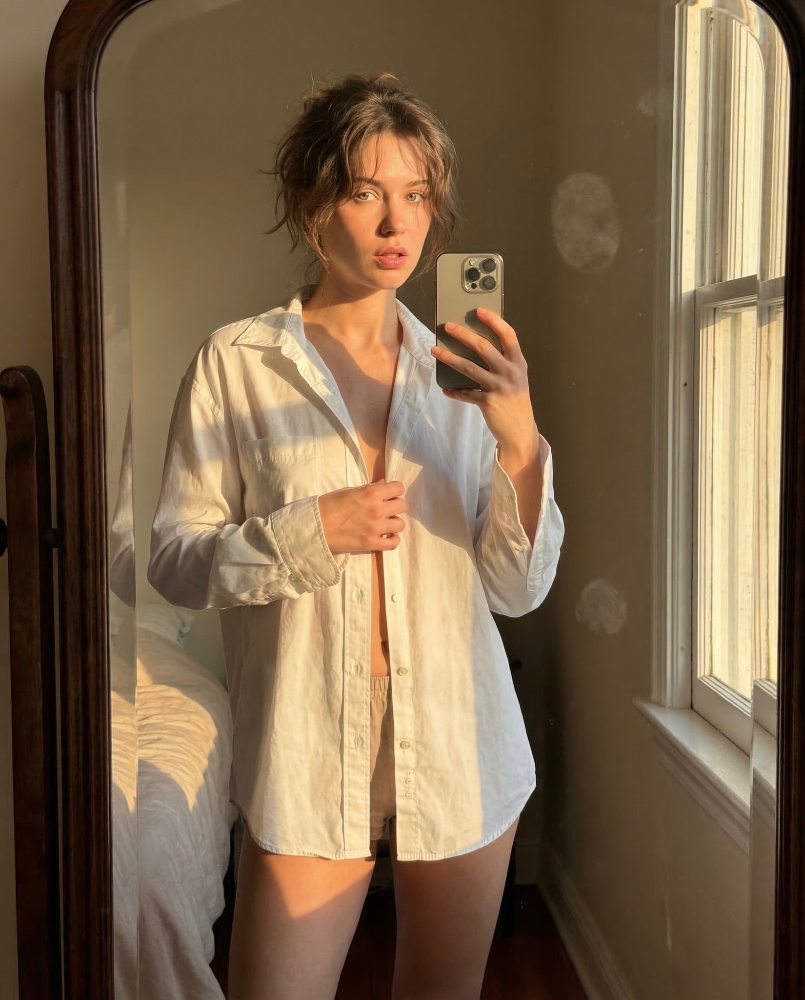 Copy{ "meta": { "camera": "iPhone 17 Pro", "lens": "35mm", "aspect_ratio": "4:5", "style": "raw iphone indoor realism, natural HDR, soft grain" }, "scene": { "location": "bedroom mirror", "time": "golden hour sunset leaking through window", "atmosphere": "warm quiet room, soft shadows, intimate silence" }, "lighting": { "primary": "golden sunlight hitting from side", "effect": "fabric slightly translucent, warm glow on skin, natural highlights" }, "subject": { "pose": { "position": "standing in front of mirror", "action": "mid-unbutton shirt moment", "body": "one hand holding shirt open slightly, other holding phone", "torso": "subtle forward lean" }, "expression": { "eyes": "locked into mirror", "mouth": "barely parted", "energy": "caught in a private moment" }, "hair": { "style": "soft messy natural fall" }, "outfit": { "top": { "type": "oversized white button-up", "state": "half unbuttoned", "effect": "light passing through fabric" }, "bottom": { "type": "minimal lounge shorts", "color": "neutral" } } }, "camera": { "angle": "mirror selfie slight tilt", "distance": "medium", "imperfection": "tiny blur + fingerprint smudge on mirror" } }