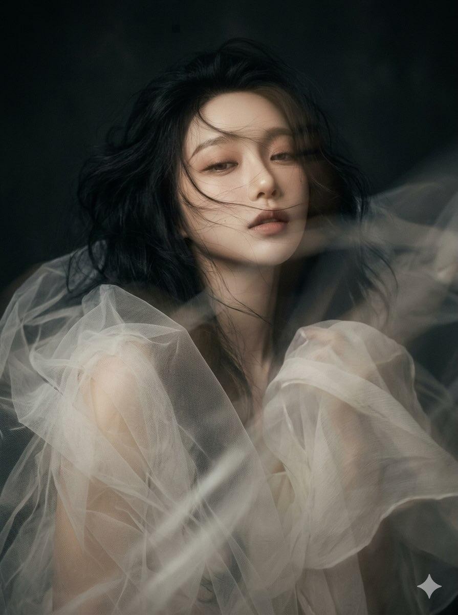 Copy[Face Reference] Use the provided reference image to match the subject's facial identity and structure. Maintain consistent facial features including face shape, eyes, nose, lips, and overall proportions. [Style & Mood] Create an ethereal, cinematic portrait in a "dreamcore" / "dark fantasy" aesthetic. Focus on mood, motion, and softness rather than sharp detail. The image should feel emotional, surreal, and slightly haunting. [Subject & Pose] A young woman standing facing the camera with a slightly lifted chin, giving a graceful and statuesque presence. Her head is gently tilted to one side. Her eyes are half-closed (hooded), gazing softly toward the camera with a dreamy, melancholic, introspective emotion. Her lips are slightly parted. [Hair & Motion] Dark, voluminous hair that is wind-swept and tousled. Loose strands flow across her face, adding movement and a sense of wild, untamed beauty. [Clothing & Fabric] She is wrapped in sheer, translucent white tulle or chiffon fabric. The fabric appears layered, floating, and swirling around her body, partially obscuring her form and creating a ghostly, nymph-like presence. [Composition] Medium close-up shot. The subject is centered in the frame, becoming the main focal point. [Lighting] Low-key, moody lighting. Her face is softly illuminated as the brightest point, while the background fades into near darkness. Use a subtle chiaroscuro effect. [Color Palette] Muted and minimal tones: deep blacks, soft whites/creams, and natural skin tones. [Effects & Atmosphere] Use long exposure or intentional camera movement (ICM) to create motion blur and ghosting effects. Add soft streaks or light trails crossing the frame. Apply soft focus overall, keeping only partial clarity on the face. [Quality & Style Tags] cinematic photography, fine art portrait, soft focus, motion blur, long exposure, dreamcore, dark fantasy, ethereal, moody lighting, high contrast, artistic blur, ghosting effect, surreal atmosphere