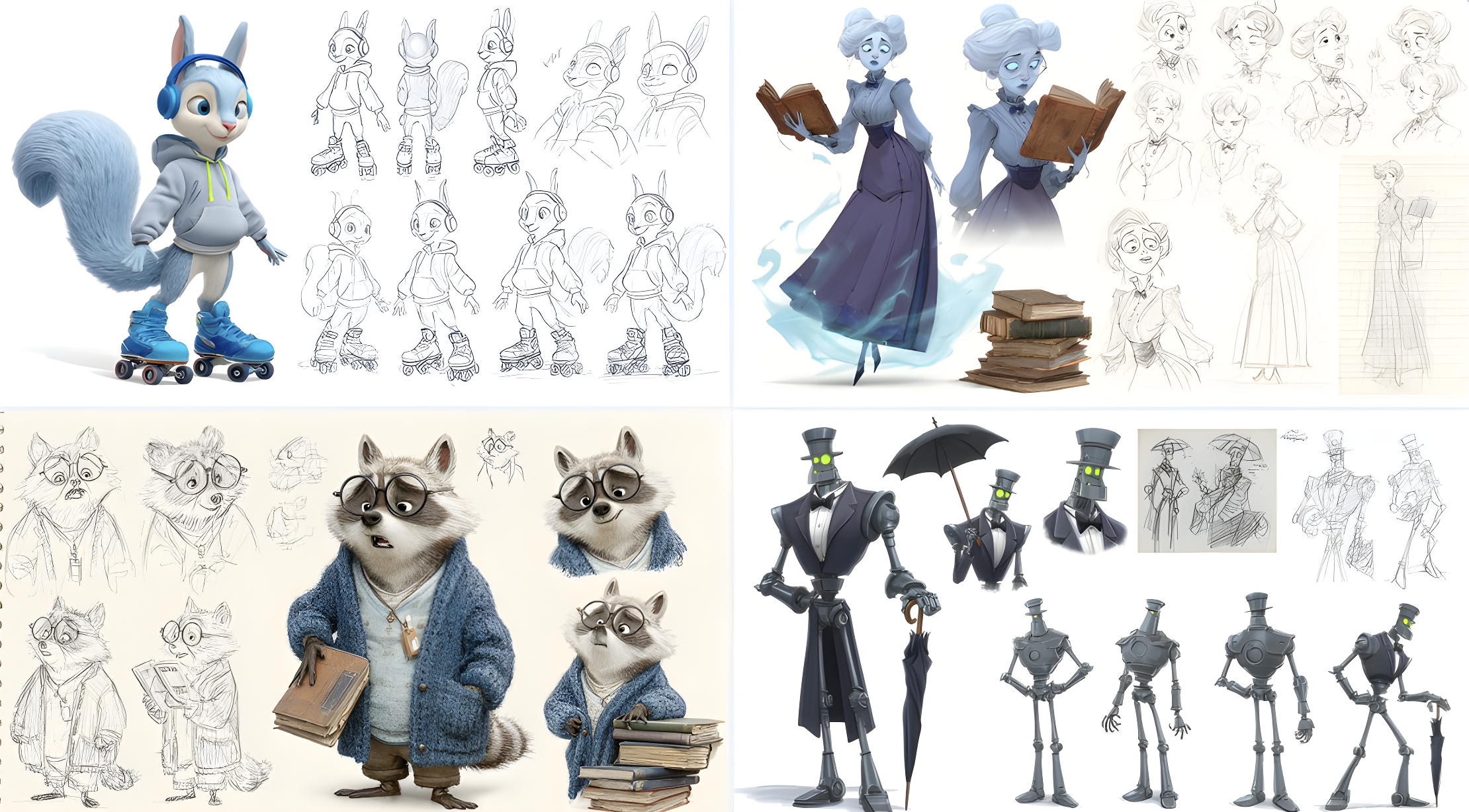 CopyA character sheet of [detailed description of thecharacter], in the style of Pixar, featuring multiple poses and expressions from different angles, including concept art, pencil sketches, a full-body reference sheet, and a white background. The sheet includes wide shots, low-angle views, 3D renders, and Octane renderings, highly detailed result.