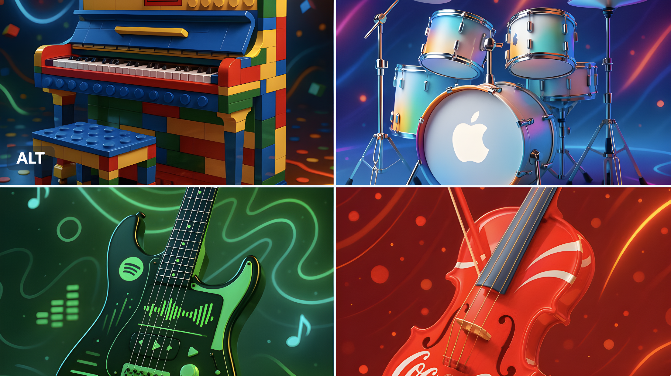 CopyA highly stylized and vibrant promotional image of a [INSTRUMENT] designed in the visual style of the [BRAND] brand — the instrument is reimagined with iconic colors, patterns, and aesthetic elements of the brand. Set in a dynamic, music-inspired environment, with glowing accents, product-style lighting, and joyful energy. Artistic fusion of music and design. 3D render look, high detail, vibrant colors, futuristic but playful.