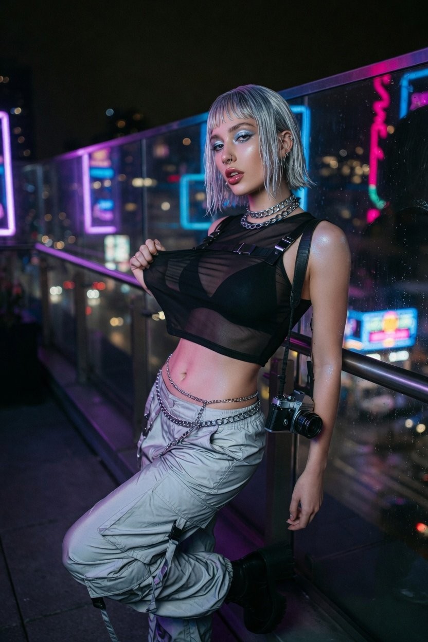 Copy{ "subject": { "description": "Young woman posing in a high-tech urban environment, looking over her shoulder.", "mirror_rules": "N/A", "age": "Early 20s", "expression": { "eyes": { "look": "Smoldering, intense", "energy": "Confident, mysterious", "direction": "Directly into the lens" }, "mouth": { "position": "Slightly open, relaxed", "energy": "Seductive" }, "overall": "Edgy, main-character energy" }, "face": { "preserve_original": "Ethereal, high-fashion features", "makeup": "Cyber-glossy: metallic silver eyeshadow, glossy berry lips, hyper-defined lashes" } }, "hair": { "color": "Icy silver-white", "style": "Sleek blunt bob with micro-bangs", "effect": "Wet-look, futuristic, sharp" }, "body": { "frame": "Toned, lithe", "waist": "Exposed, snatched", "chest": "Natural, accentuated by cropped fit", "legs": "Long, covered in utility-style cargo", "skin": { "visible_areas": "Stomach, collarbones, shoulders", "tone": "Fair, porcelain", "texture": "Flawless, slight shimmer highlight on high points", "lighting_effect": "Cool-toned neon blue rim light reflecting off skin" } }, "pose": { "position": "Leaning against a glass railing", "base": "One hip popped, one leg bent against the rail", "overall": "Turning torso toward the camera, one hand pulling at the collar of her top" }, "clothing": { "top": { "type": "Sheer black mesh crop top over a minimalist bralette", "color": "Black", "details": "Industrial straps, silver buckles", "effect": "Translucent, high-tension fit" }, "bottom": { "type": "Reflective utility cargo pants", "color": "Grey/Silver", "details": "Many pockets, baggy fit", "effect": "Sits low on the hips" }, "extras": "Silver chain belt." }, "accessories": { "headwear": null, "jewelry": "Chunky silver choker, multiple hoop ear piercings", "device": null, "prop": "Vintage film camera hanging from shoulder" }, "photography": { "camera_style": "High-end 35mm digital street photography", "angle": "Slightly low angle", "shot_type": "Three-quarter length", "aspect_ratio": "9:16", "texture": "Sharp, grainy, high-contrast, night-time mood", "lighting": "Neon city lights, cool blues and magenta hues, dramatic shadows", "depth_of_field": "Shallow, blurry city lights in background" }, "background": { "setting": "Modern urban rooftop at night", "wall_color": "Dark concrete/Glass", "elements": [ "Blurred city skyline with neon lights", "Glass architectural railing", "Distant traffic bokeh", "Moody shadows" ], "atmosphere": "Futuristic, cinematic, edgy", "lighting": "Ambient neon from the city below" }, "the_vibe": { "energy": "Rebellious, futuristic, confident", "mood": "Electric", "aesthetic": "Cyber-streetwear, Y2K-future, main-character", "authenticity": "High; feels like a candid shot during a night out", "intimacy": "Medium; intense focus on the subject", "story": "Taking a moment on a rooftop after a long night in the city.", "caption_energy": "'system overload.' or just a dark blue heart." }, "constraints": { "must_keep": [ "Icy silver bob hair", "Sheer black mesh top", "Neon night lighting", "Reflective cargo pants" ], "avoid": [ "Bright daylight", "Soft, warm tones", "Cluttered backgrounds", "Smiling expressions" ] }, "negative_prompt": [ "daylight", "sunny", "smiling", "cringe", "warm lighting", "soft focus", "blurry face", "studio background", "unnatural posing", "over-saturated" ] }