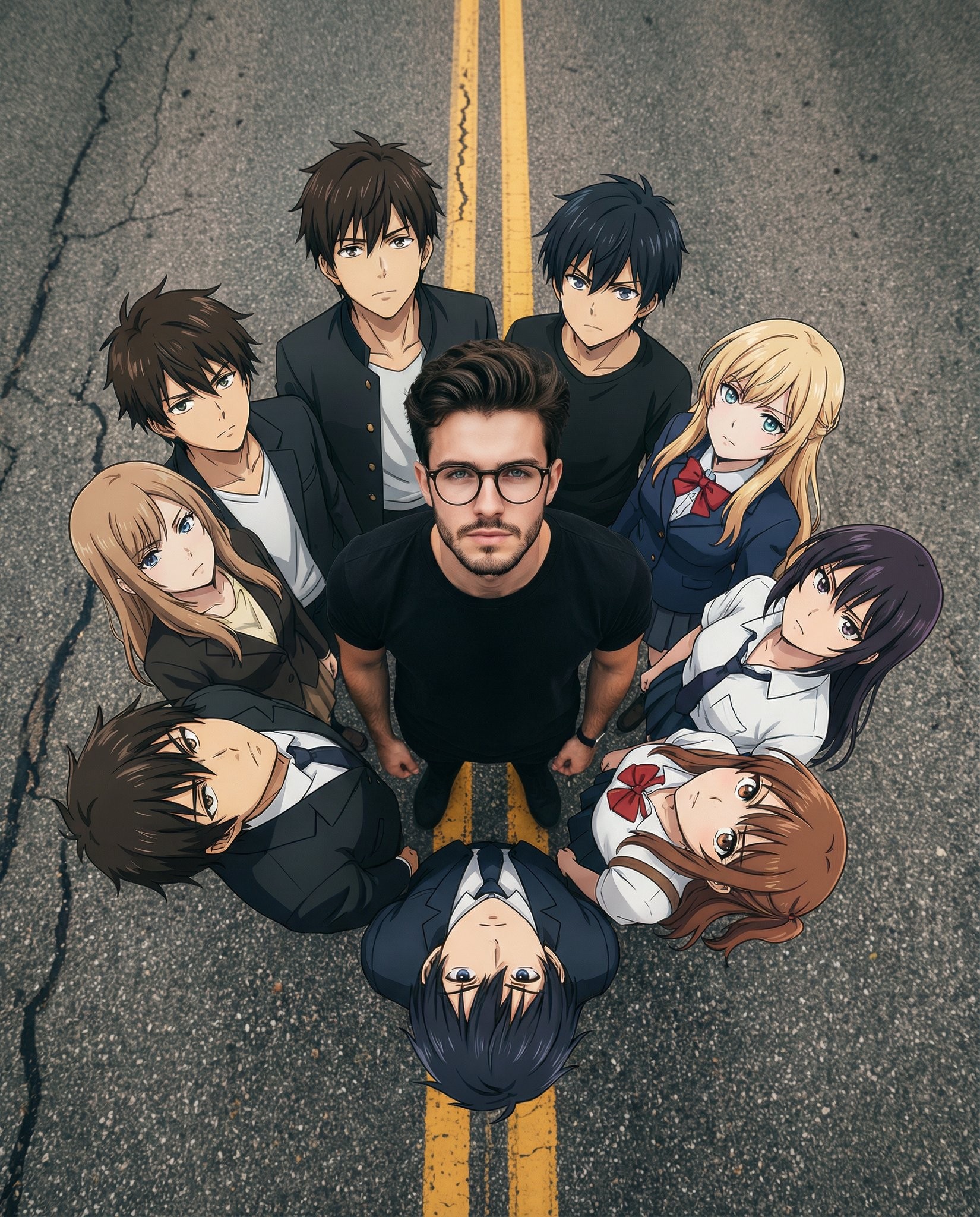 CopyCreate a cinematic hybrid real-life + anime group scene from a high top-down camera angle, matching the same road background, double yellow lines, framing, and composition as the reference image. The characters stand together in a tight formation, looking upward toward the camera with confident, serious expressions. Keep the same vertical perspective, spacing, and street texture. Main Human Subject (Center). Place me in the middle of the group as a real-world human boy using my face reference.
