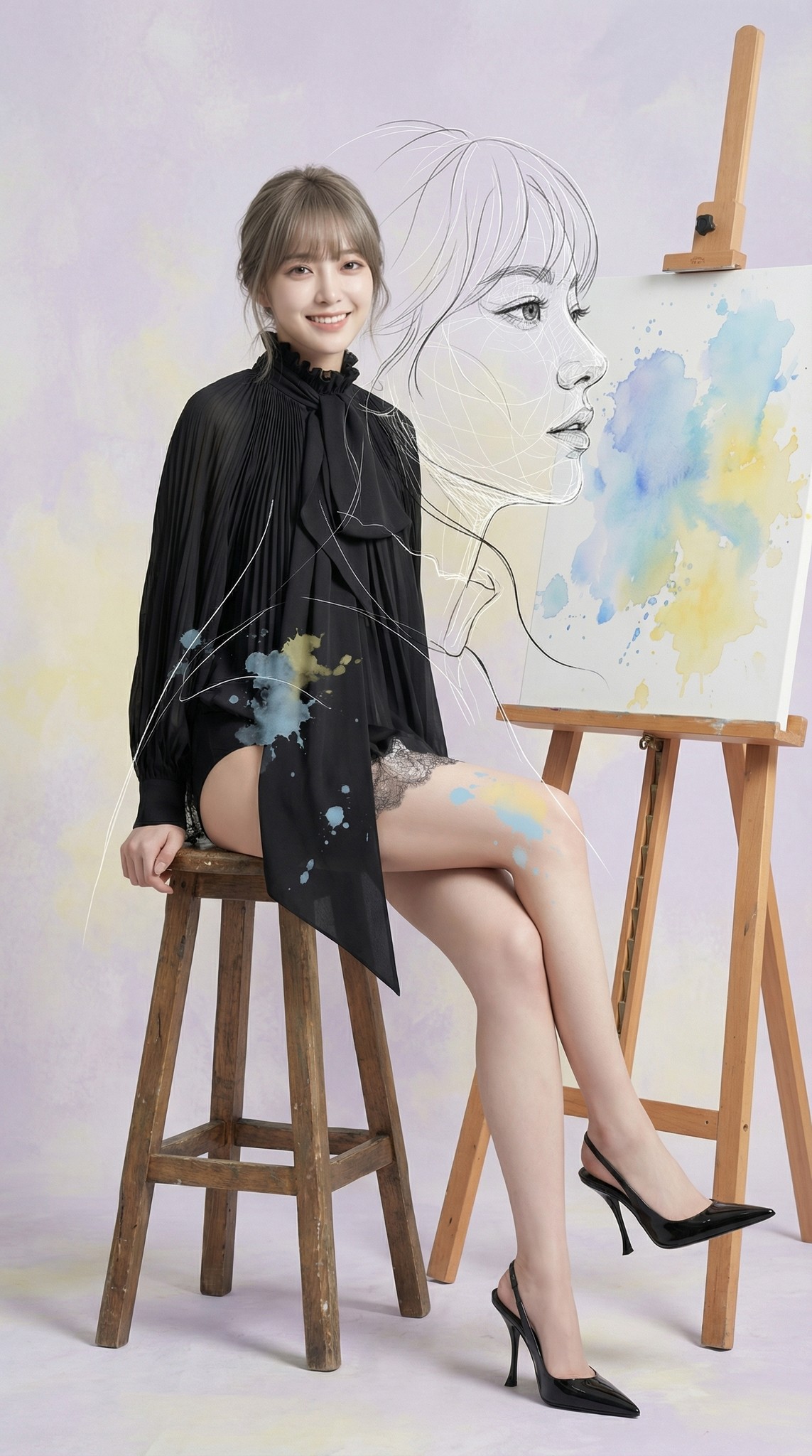 CopyA hyper-realistic full-body shot of a young beautiful female artist sitting on a wooden stool next to an easel. She wears a grey newsboy cap, a light grey oversized linen tunic, and white utility boots with yellow accents. Overlaid across the scene is a delicate, ethereal wireframe sketch of her face in profile, with fine ink lines flowing like hair. The background is a clean, minimal white studio. Splashes of watercolor paint in soft blue and yellow are integrated into her clothes and the canvas. Background is a soft textured painterly wash of light lilac and yellow, soft diffused studio lighting, dreamy atmosphere. 8k resolution, mixed media style, intricate line art layered over photorealism.