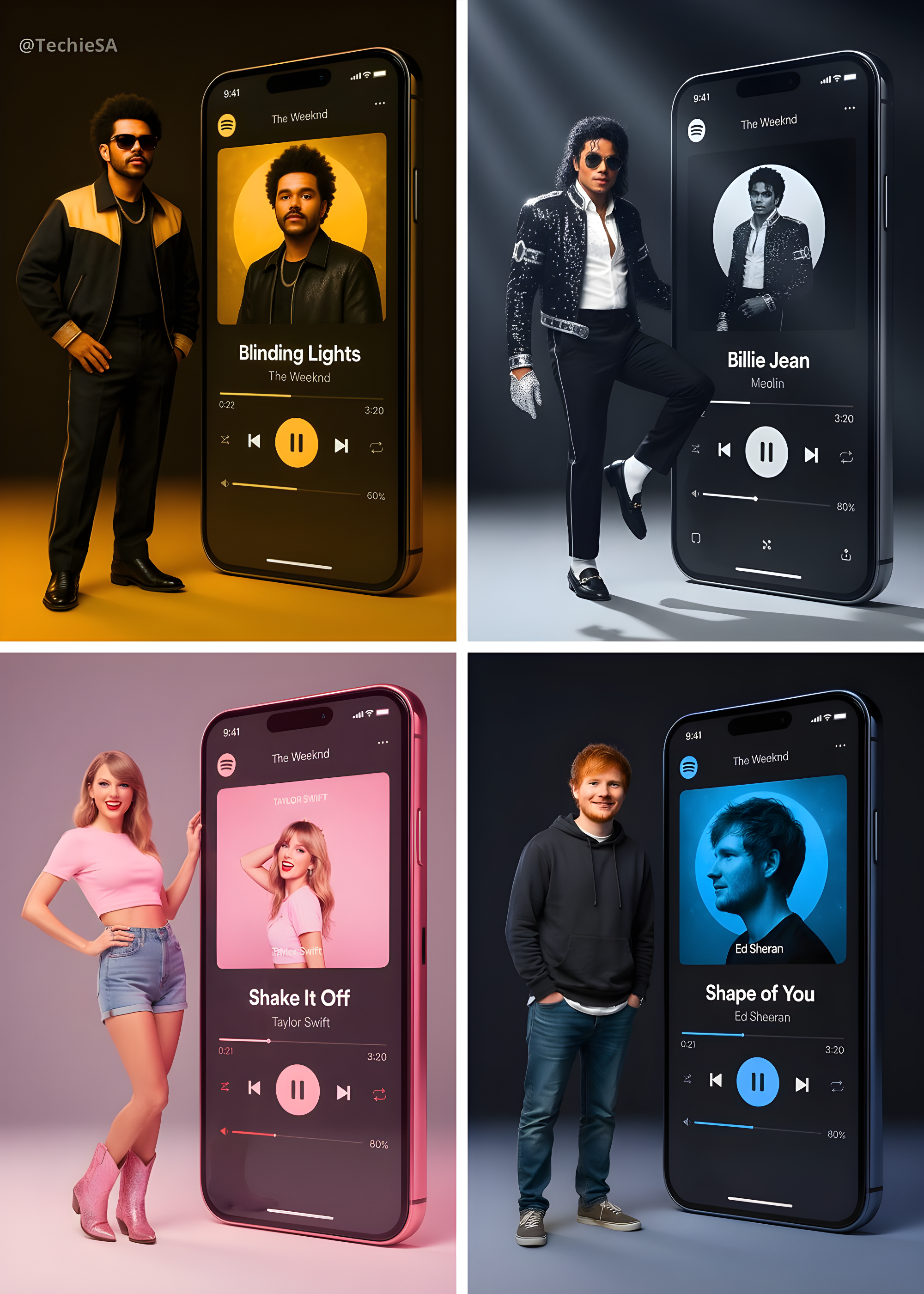 CopyA realistic full-body portrait of a [ARTIST] in their signature style, positioned next to a giant vertical smartphone displaying a Spotify interface. The phone screen shows a music player interface featuring the song “[SONG]” with signature [COLOR] accent colors at approximately 80% opacity for a premium aesthetic effect. The artist wears their characteristic outfit and styling. Their pose is confident and editorial, embodying the mood and energy of the song. Expression matches their iconic persona. Technical specifications: • Plain background with subtle [COLOR] lighting accents • Soft studio lighting with colored gels in signature [COLOR] tones • 35mm or 50mm lens, f/2.2, ISO 100-160, shutter speed 1/125 • Sharp focus on subject and phone interface • Editorial style consistent with premium music platform campaigns