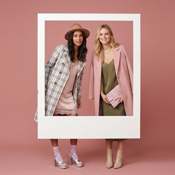 Pink Background Dual Model Polaroid Fashion Editorial