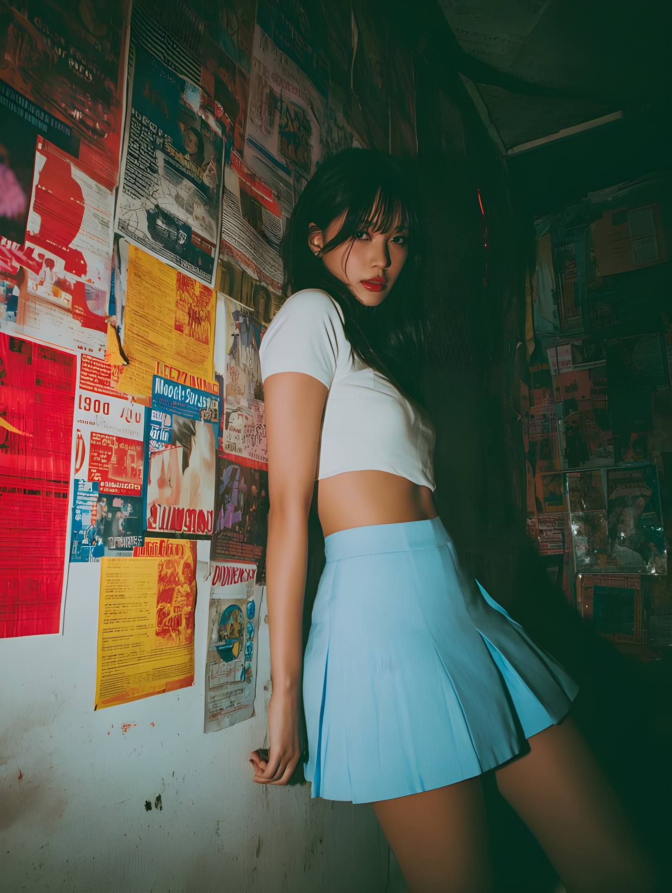 CopyThe image features a subject with long, dark hair, dressed in a short-sleeved, cropped white top and a high-waisted, pleated blue mini skirt that ends well above mid-thigh, fitting snugly to accentuate the figure. The subject is captured in a slightly turned pose, leaning forward with one hand resting on a wall covered in a dense collage of overlapping posters, flyers, and advertisements in various colors such as red, yellow, blue, and white, with text in multiple languages, suggesting an urban or vintage environment. The wall appears worn, with visible creases and minor damage, adding to the nostalgic ambiance. The subject's facial expression, partially visible from a side angle, conveys a subtle mix of curiosity and playfulness. The lighting is dim with a warm tone, casting soft shadows that enhance the mood. The composition employs a low-angle perspective, drawing attention to the subject's lower body and the skirt's height, with a sharp focus on the subject against a slightly blurred background. The overall mood is provocative yet nostalgic, blending modern attire with a retro aesthetic. Technically, the image exhibits a deliberate soft-focus effect, contributing to a hazy, dreamlike quality that softens details and edges. Additionally, noticeable grain and noise texture are present, enhancing the vintage aesthetic and adding a tactile, gritty feel to the photograph. The resolution remains moderate, typical of digital photography, with a slightly desaturated color profile featuring a vintage filter effect. The aspect ratio is vertical, approximately 4:5, supporting the focused framing of the subject.