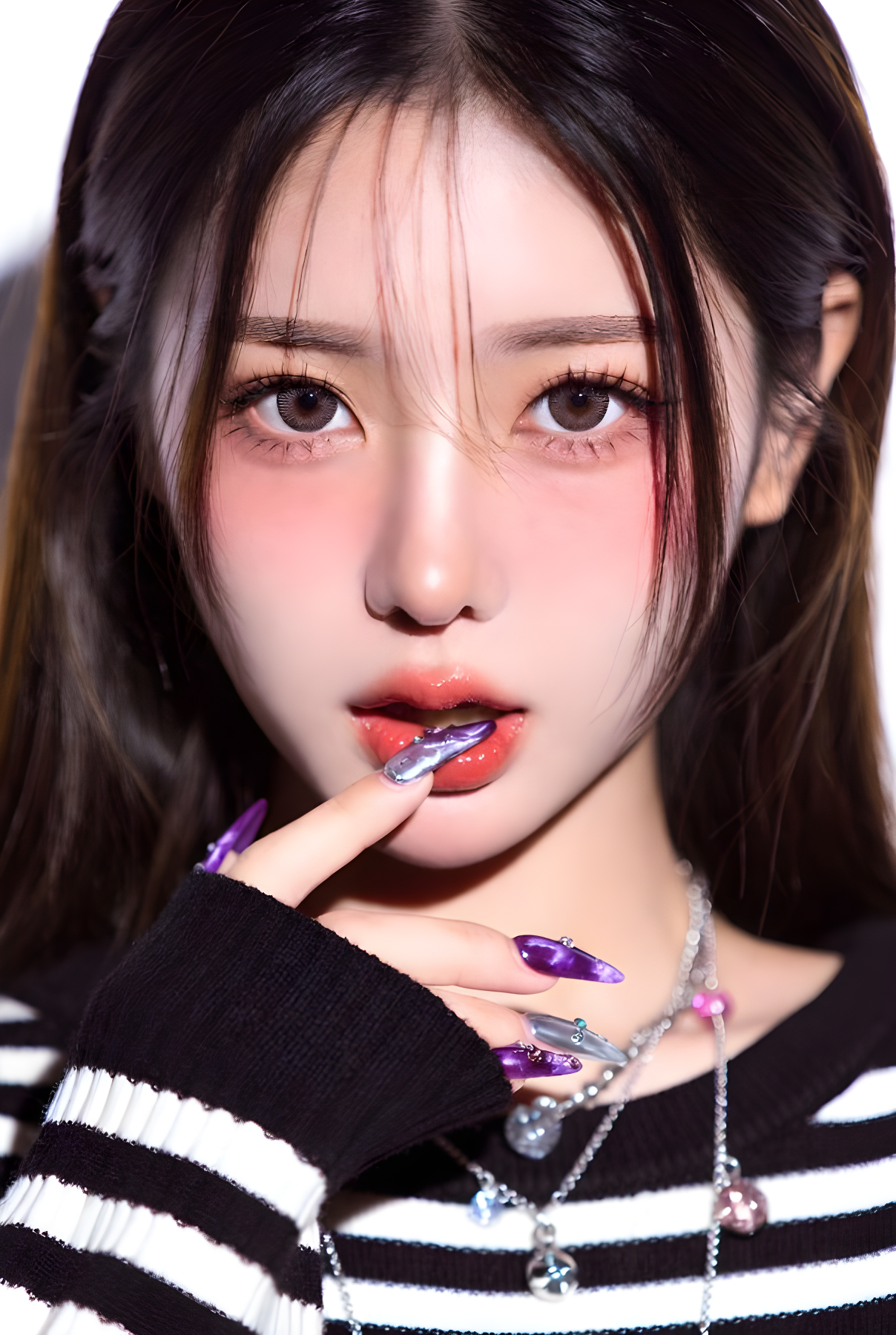 Copy[Prompt] Ultra-close-up portrait of a stunning young East Asian woman with flawless porcelain skin, large sparkling dark brown eyes with long lashes, subtle pink blush, glossy red-tinted lips, long straight silky dark brown hair with subtle highlights, making a playful finger-frame gesture around one eye with both hands, extremely detailed long almond-shaped nails with glossy purple-marble and silver chrome galaxy nail art with tiny rhinestones, wearing black-and-white horizontal striped oversized knit sweater with ribbed cuffs, layered delicate silver necklaces with crystal pendants and small pink gems, soft studio lighting with bright white seamless background, high-fashion beauty editorial style, razor-sharp details, perfect skin texture with natural glow, shallow depth of field, shot on 85mm lens f/1.4, ultra-realistic photorealism, 8k, masterpiece, best quality. [Negative Prompt] blurry, low resolution, deformed hands, extra fingers, missing fingers, bad anatomy, ugly nails, cheap makeup, overexposed, underexposed, text, watermark, logo, cartoon, 3d render, plastic skin, doll face, cross-eyed, distorted proportions, old, child. [Steps] 60. [Cfg Scale] 7.5. [Sampler] DPM++ 2M Karras. [Width] 832. [Height] 1216. [Seed] -1.