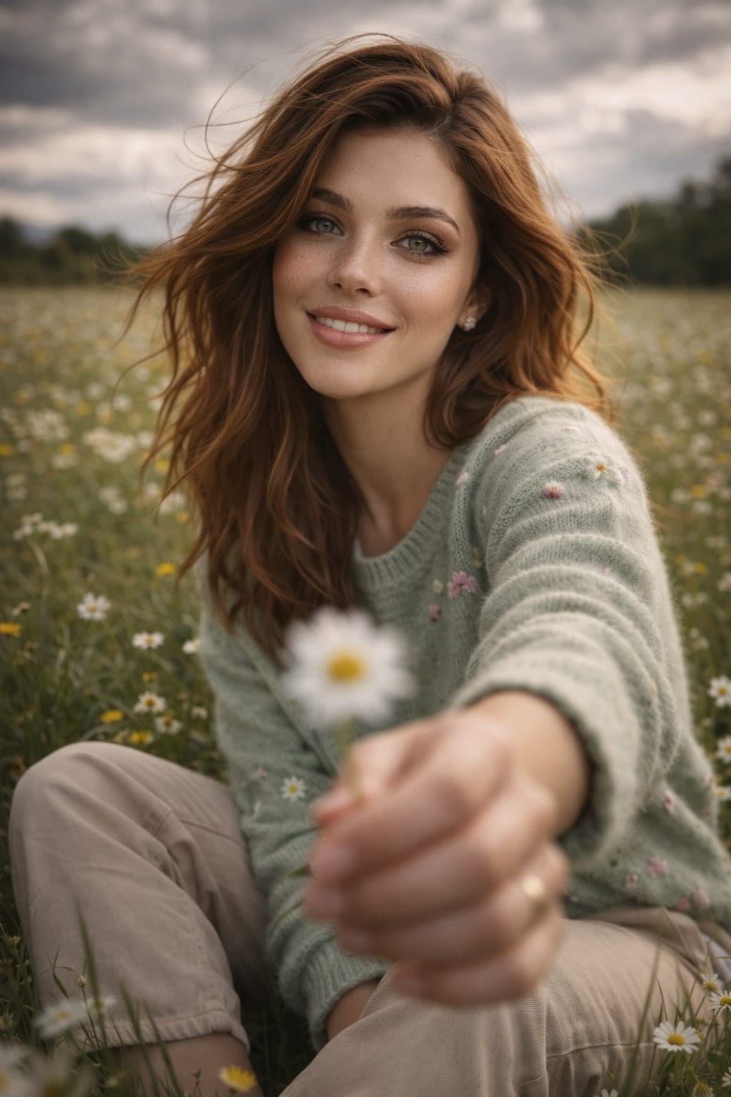 CopyCinematic lifestyle portrait of a young woman with the exact same face as the reference image, sitting in a wide open wildflower meadow filled with small white daisies and yellow flowers. She is sitting casually on the grass with her legs relaxed and slightly crossed, leaning slightly forward while holding a small white daisy toward the camera with her hand, creating a soft foreground blur. She has natural beauty, soft facial features, light freckles, warm smile, and medium-length wavy ginger / auburn hair flowing naturally in the breeze. She is wearing a soft pastel green knitted sweater with delicate embroidered floral details and beige casual trousers. The environment is a bright spring countryside meadow under a dramatic cloudy sky. Soft natural daylight, warm tones, gentle wind moving the grass and flowers. The perspective is slightly low and close, with shallow depth of field focusing on her face while the flower in the foreground is slightly out of focus. photorealistic, cinematic composition, 50mm lens, shallow depth of field, natural color grading, ultra realistic skin texture, soft lighting, fashion editorial photography, high detail, 8k