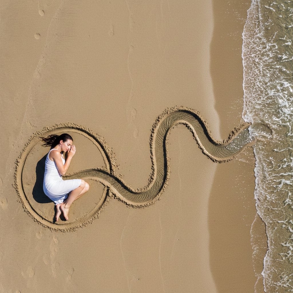 Copy{ "frame": { "aspect_ratio": "3:2", "shot_size": "Wide Shot (WS)", "orientation": "Landscape", "composition_guide": "Diagrammatic Layout: Woman on left, Sea on right, connected by a sinuous line." }, "subject": { "subject_type": "Human", "identity_summary": "Female figure acting as the anchor for a sand-art installation.", "pose_and_action": { "description": "Lying in a tight fetal position inside a sand circle.", "body_position": "Curled on side, knees tucked high.", "facial_expression": "Peaceful, sleeping.", "gaze_direction": "Eyes closed." }, "inventory": { "wardrobe": "White dress, wet and clinging to the body.", "hair_style": "Dark, wet, splayed out on the sand." } }, "environment": { "setting_type": "Outdoor", "location_description": "Flat sandy beach with specific sand-art markings.", "background_elements": "The beach features a deep, hand-dug trench snaking from the sea to the woman's belly. This trench is filled with sea water. A separate circular groove surrounds the woman." }, "camera": { "angle": "Bird's Eye View", "lens_type": "35mm Wide Angle", "aperture": "f/8" }, "post_processing": { "style_modifiers": "Land Art, Conceptual, National Geographic", "quality_boosters": "8k, sharp focus, hyper-realistic water texture" } }