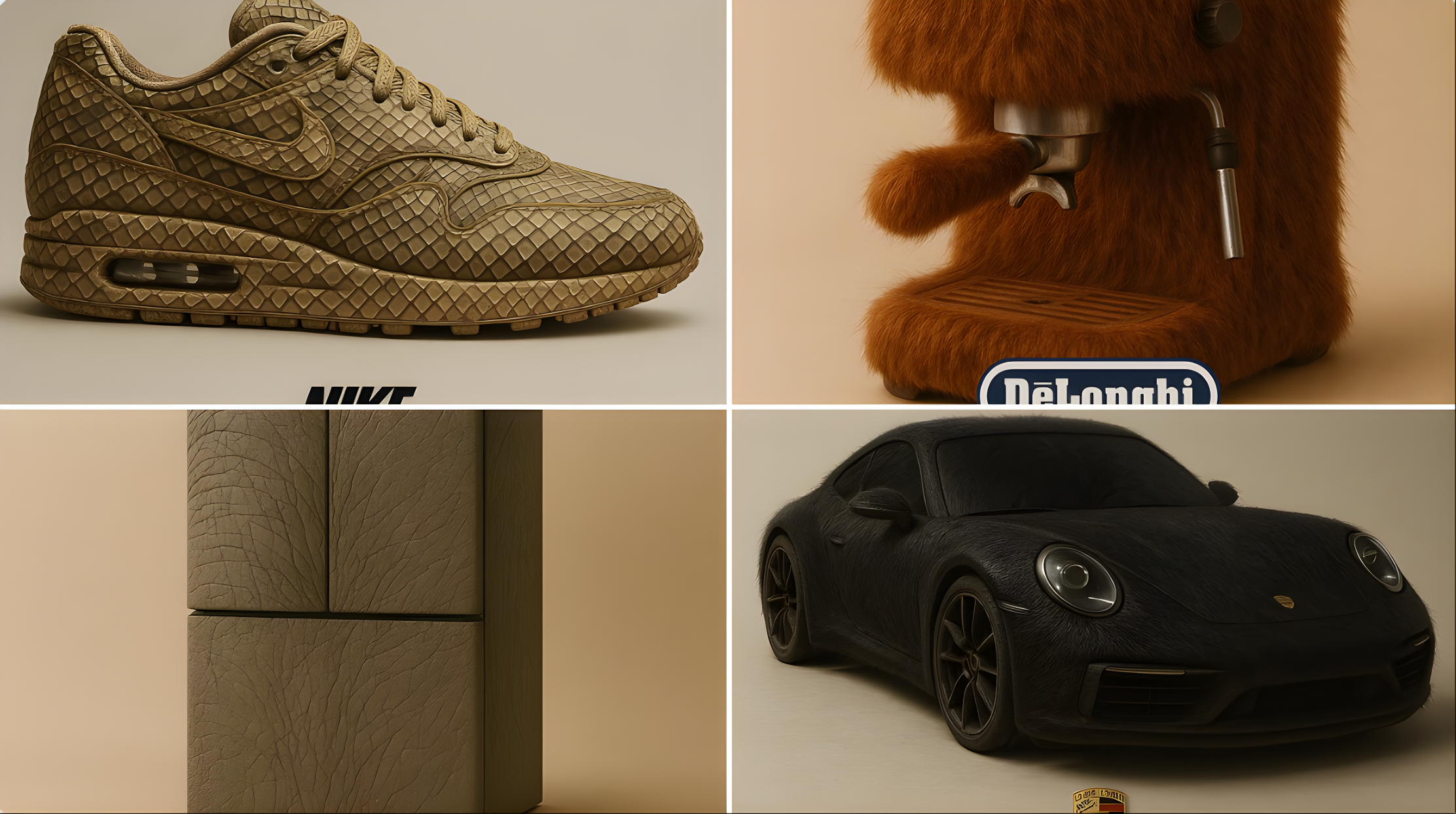 CopyA high-quality studio photograph of a [BRAND + OBJECT] fully covered in ultra-realistic [ANIMAL] texture (e.g., fur, feathers, skin, or scales), placed against a soft neutral background. The object’s original shape, key design elements, and brand identity remain clearly visible beneath the animal’s organic surface. Integrate the official logo of the brand prominently into the composition. Automatically generate a compelling and brand-appropriate slogan that draws symbolic inspiration from the animal’s qualities and matches the tone of a premium advertising campaign. The image must feature clean composition, soft shadows, minimalist styling, professional lighting, and highly detailed textures—each hair, scale, or wrinkle should be visible in sharp detail. Format 1:1.
