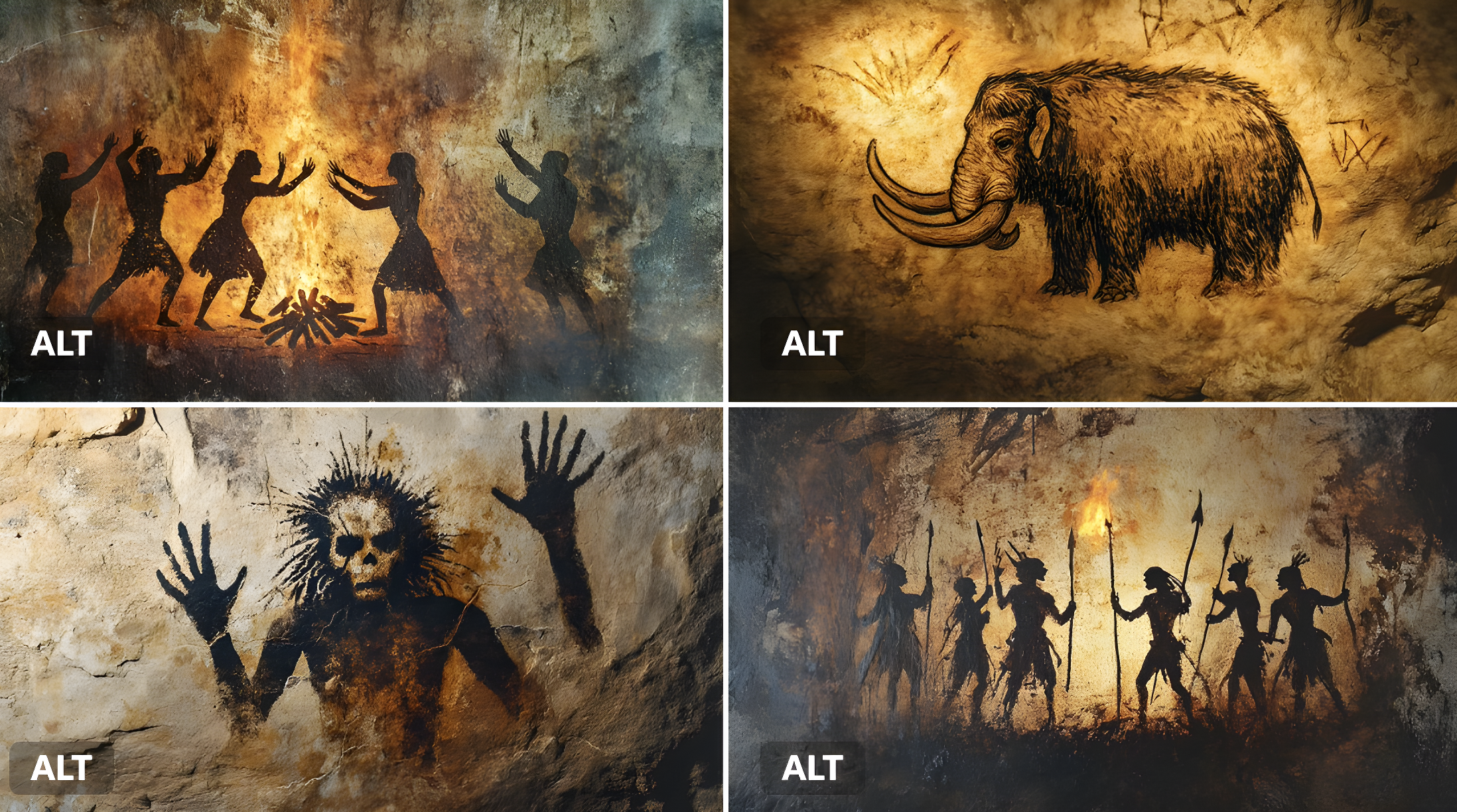 CopyA cave painting of a [subject], rendered with primitive ochres and charcoal lines on a rough stone wall. Smudged handprints, crude geometry, and flickering torchlight add a primal, ancient mood.