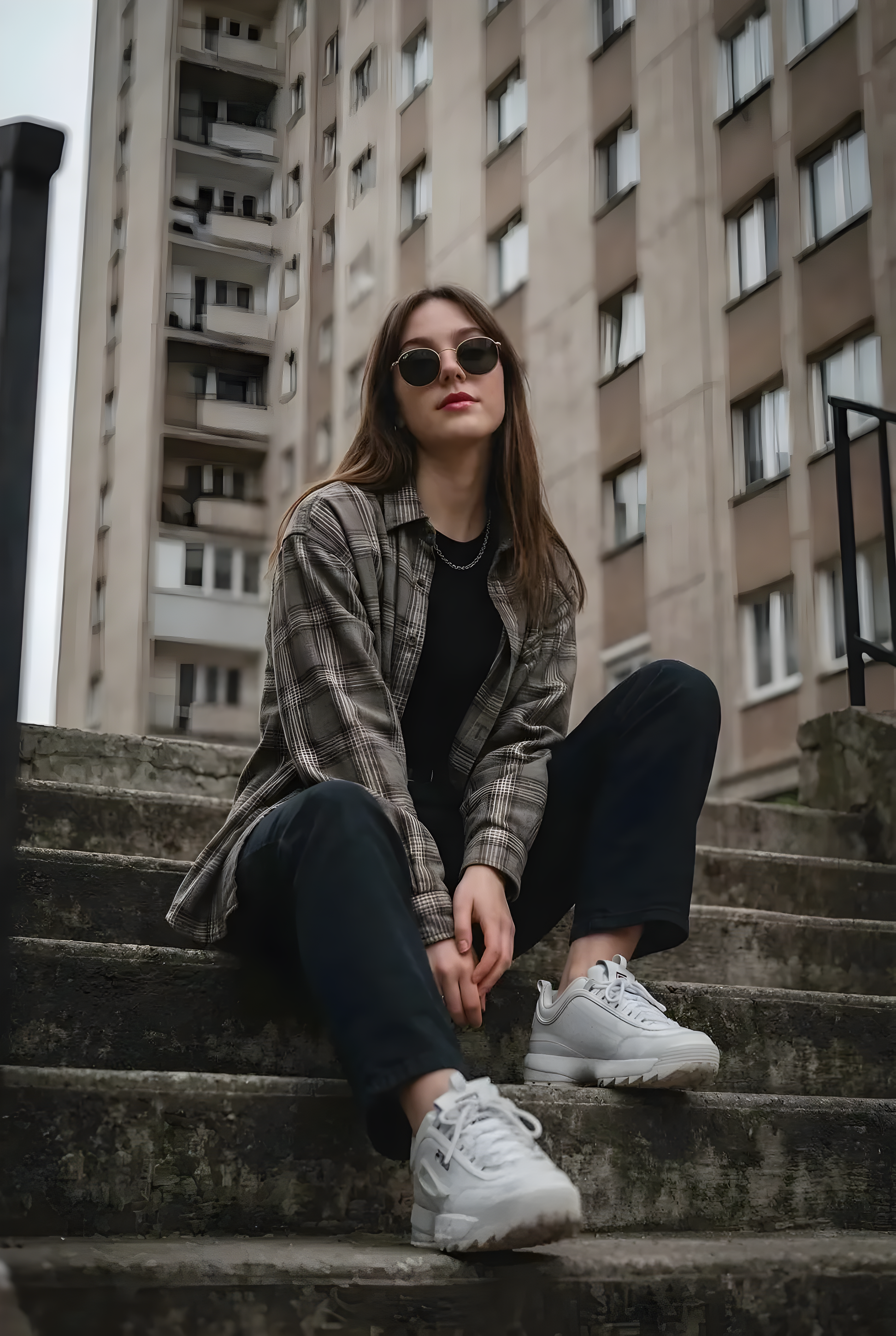 CopyYoung woman sitting casually on outdoor concrete stairs, posing with a cool, confident demeanor, oversized grey and beige plaid flannel shirt worn open, plain black crew-neck t-shirt underneath, loose-fitting dark trousers, chunky white sneakers, long, straight light brown hair with a middle part falling naturally over the shoulders, neutral poised expression with defined red lips, eyes concealed behind round dark sunglasses with thin metal frames, simple silver chain necklace, urban setting with a tall grey concrete apartment block featuring a grid of windows in the background, weathered concrete steps in the foreground, soft, diffuse natural daylight indicative of an overcast sky creating even illumination without harsh shadows, low-angle shot looking up at the subject emphasizing the height of the background building, sharp focus on the subject with a slightly softened background, urban streetwear photography, 90s grunge aesthetic, moody and atmospheric, cinematic vertical composition.