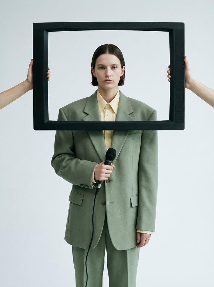 CopyMinimalist conceptual fashion portrait of an androgynous model wearing an oversized sage green suit with a pale yellow button-up shirt, holding a black wired microphone. Clean white studio background with soft diffused lighting and muted pastel tones. A large black rectangular frame is positioned around the model's head and shoulders, held by unseen hands from the sides, creating a surreal "framed reality" effect. Neutral facial expression, straight short hair parted in the middle, editorial high-fashion aesthetic, sharp details, soft shadows, balanced composition, contemporary art photography style, medium format camera, ultra-realistic, high resolution.