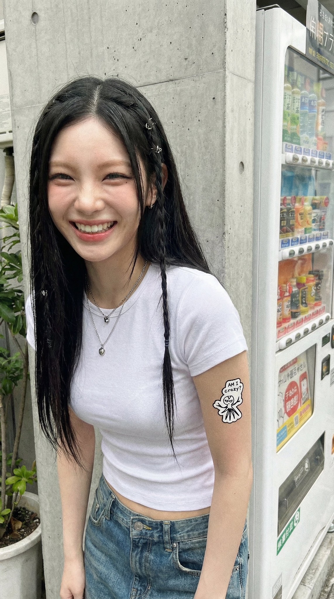 Copy【inky-black long straight hair with cool blue undertone, ultra-smooth surface with fine reflective strands, center-parted with micro braids inserted asymmetrically along the sides, secured with tiny silver hair pins, natural separation and slight movement at the ends outfit: fitted white short-sleeve baby tee with clean stretch fabric, mid-rise faded blue straight-leg denim with soft wear texture, black canvas low-top sneakers with white rubber toe cap】 Casual street state layered with micro styling interventions, spontaneous emotion output recorded under low-structure environment.