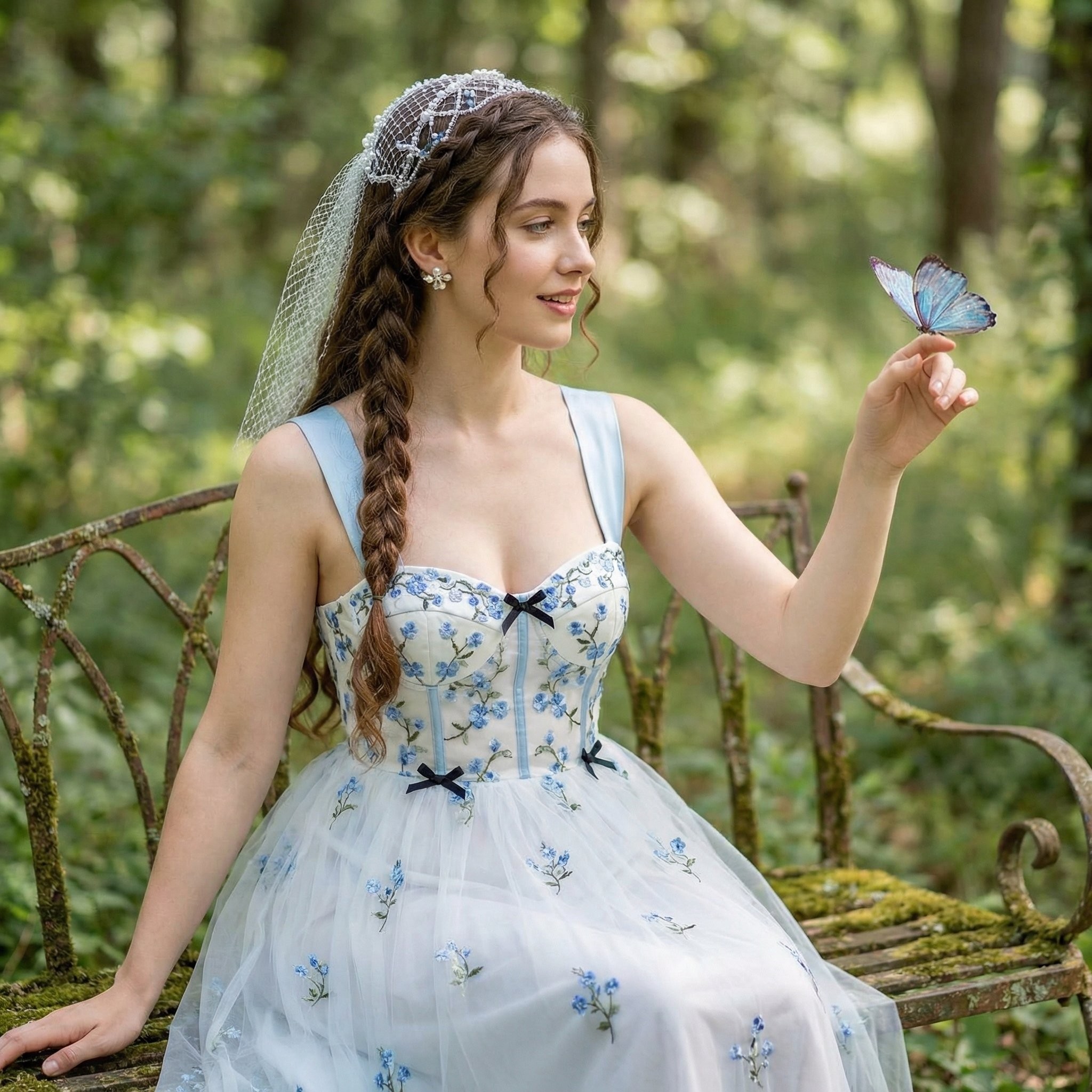 CopyAn ethereal, high-detail outdoor portrait of a young woman seated on a moss-covered, ornate wrought-iron garden bench in a dreamy forest setting. She has long, braided, wavy brown hair and a soft, curious expression as she gazes at a delicate, glowing blue butterfly resting on her outstretched left index finger. She wears a cottagecore-inspired dress in light blue and white, featuring wide satin straps, a sweetheart neckline, and a structured white bust panel adorned with intricate blue floral embroidery, ribbon details, central flower appliqués, and small black bow accents. The skirt includes a sheer white tulle overlay decorated with tiny blue floral sprigs. Her right arm rests gently by her side, while her left arm is raised toward the butterfly. She accessorizes with a light-blue beaded headpiece with a soft veil and small pearl floral earrings. The environment is lush and magical, with soft, dappled natural light filtering through trees. Fine details are visible in the embroidery, moss texture, and the butterfly's wings. Shot with a shallow depth of field, creating a soft, dreamy bokeh background of blurred foliage. Ultra-realistic, cinematic, 8K resolution.