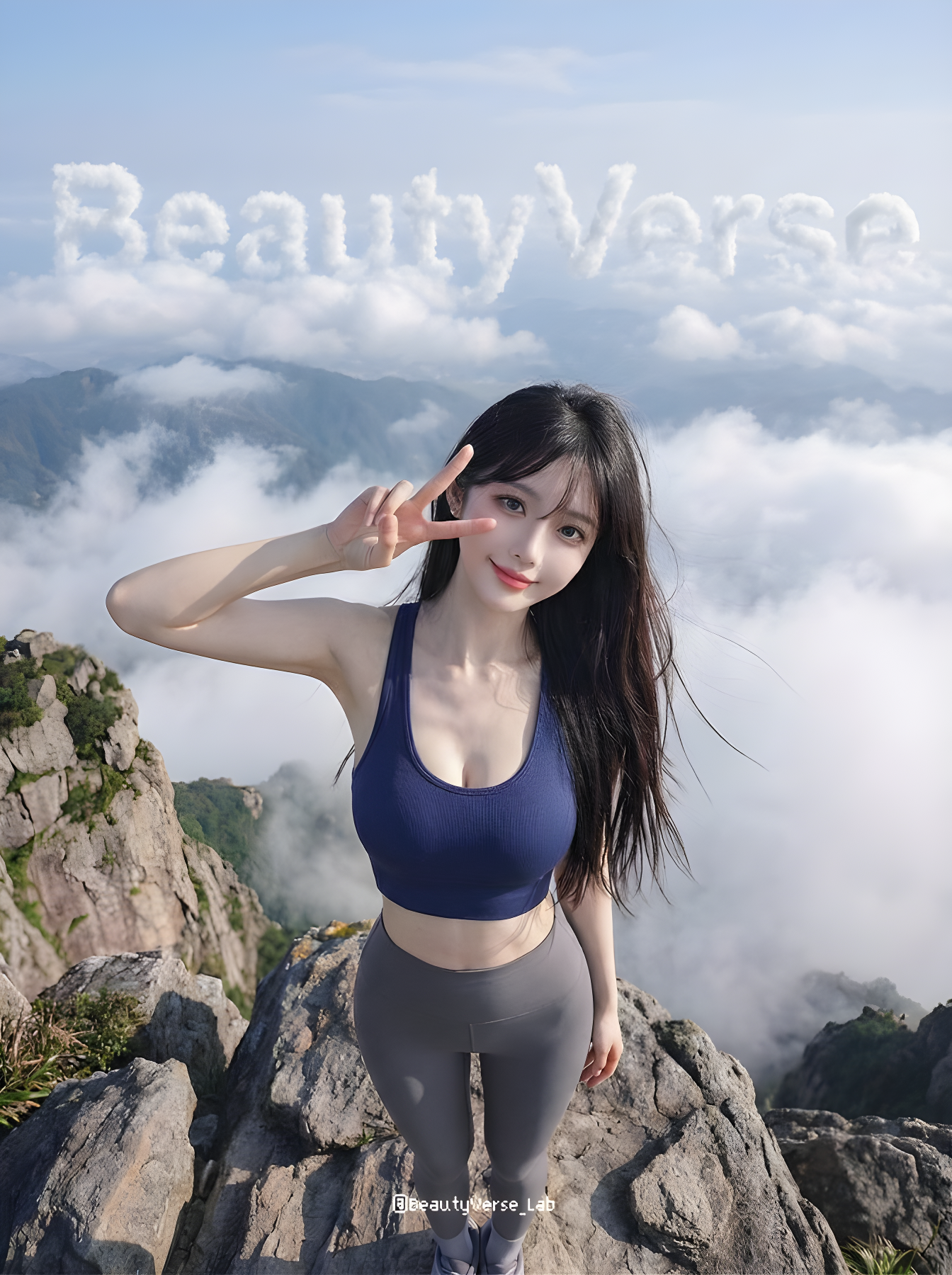 CopyExtreme high-angle bird's-eye view full-body shot of a woman standing confidently at the highest point of a rugged mountain peak. Right hand raised near the eye making a peace sign V-sign gesture. Cheerful and cute expression with a playful smile, looking up at camera with a bright friendly gaze. The summit of a high mountain with jagged rocks and a cliff edge. Bright natural daylight with soft clouds below. Monumental cloud formations in the distant sky. Adventure outdoor photography with surrealist elements. Ultra-wide angle lens shot from above emphasizing the height of the peak. 8k resolution hyper-realistic rock textures, aspect ratio 3:4.