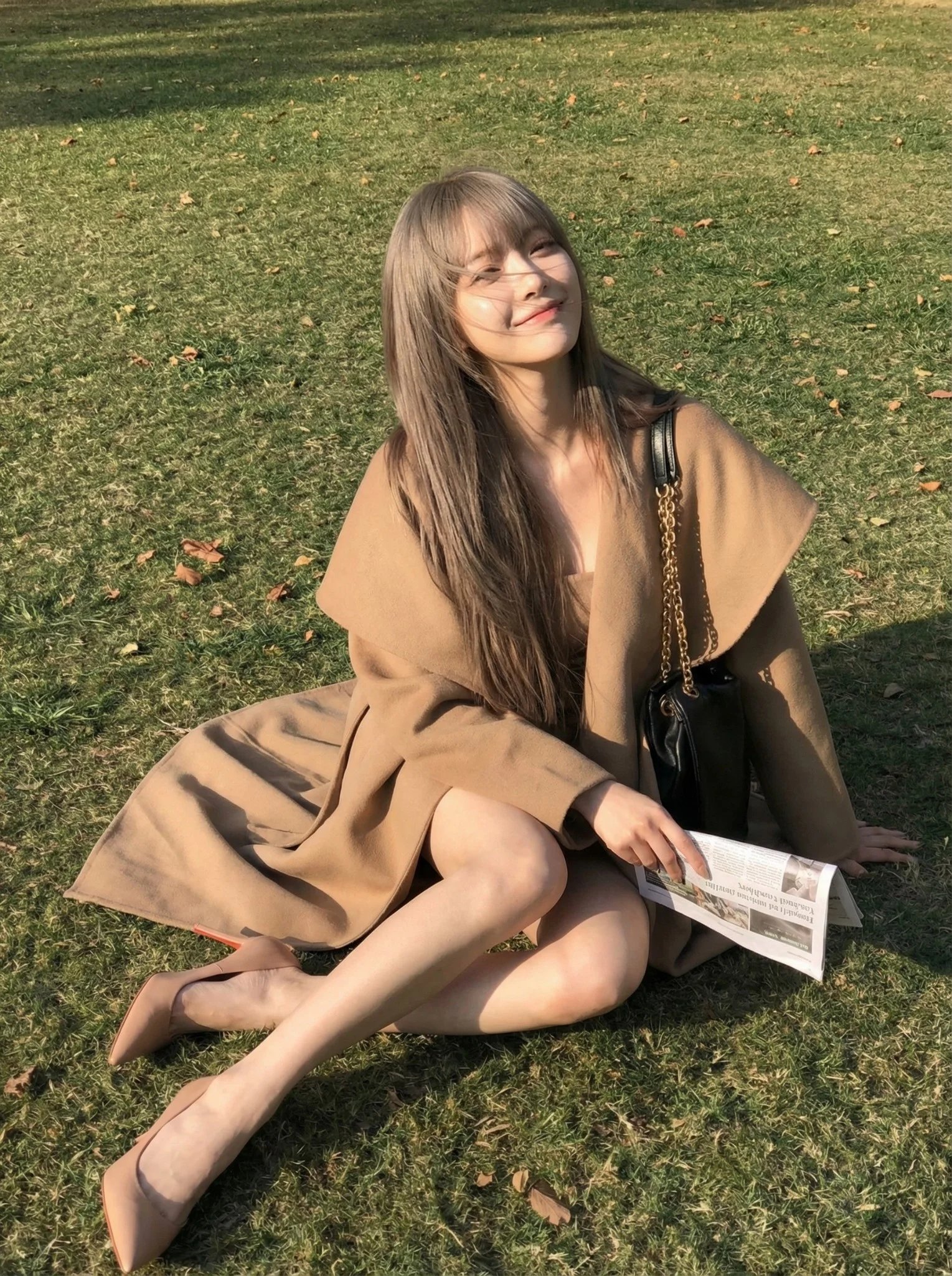 CopyA cinematic, candid shot of {User Portrait} lounging on a park lawn. The subject's head is tilted slightly upward and turned to the right, basking in the warmth of the sun (sun-drenched). Her long hair is messy and windblown, sweeping across her face and obscuring her features, adding a mysterious and spontaneous atmosphere. She holds a folded newspaper in one hand, extended casually to the side. Relaxed, reclining pose with a focus on body lines. The body sits slightly to the right of the frame, while her legs extend diagonally toward the bottom left corner of the lens. The perspective is exaggerated to emphasize extremely long, sexy leg lines and the curve of the calves. Feet are pointed, wearing nude stiletto heels, creating a continuous visual extension. {User Outfit} (Reference: An oversized, premium camel wool coat draped loosely, revealing bare legs. Nude pointed-toe heels. A black quilted handbag with a gold chain sits upright on the grass next to her hip). A sunlit urban park with texture-rich grass (green mixed with dry yellow patches). Background features a blurred black iron fence, mature trees with dappled leaves, and distant European-style architecture (clock tower hints) under a clear blue sky. Direct, hard afternoon sunlight. The light hits the subject's face and legs, creating high highlights and distinct, sharp shadows on the grass. The mood is lazy, sophisticated, and warm. 24mm or 35mm wide-angle lens used from a low angle. This focal length creates perspective distortion that elongates the legs while keeping the background context visible. Shallow depth of field (f/4.0). Fujifilm Classic Negative (NC) aesthetics. Warm, golden skin tones, rich browns and camels, deep greens in the shadows, high contrast with a film photography feel.