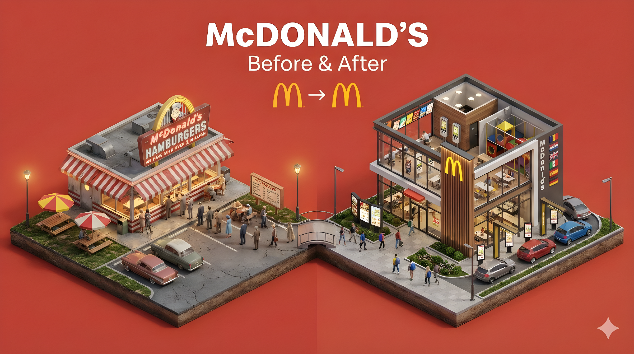 CopyCreate a clear, 45° top-down isometric miniature 3D split diorama showing [SUBJECT] before and after [TRANSFORMATION]. Use soft refined textures, realistic PBR materials, and balanced lighting across both sides. Design a single raised base divided into two environments with contrasting details. Include tiny stylized people to emphasize scale and change (no facial details). Use a clean solid [BACKGROUND COLOR] background. At the top-center, display [SUBJECT NAME] in large bold text, beneath it show 'Before & After' in medium text, and place a minimal transformation icon below. All text must automatically match the background contrast (white or black).