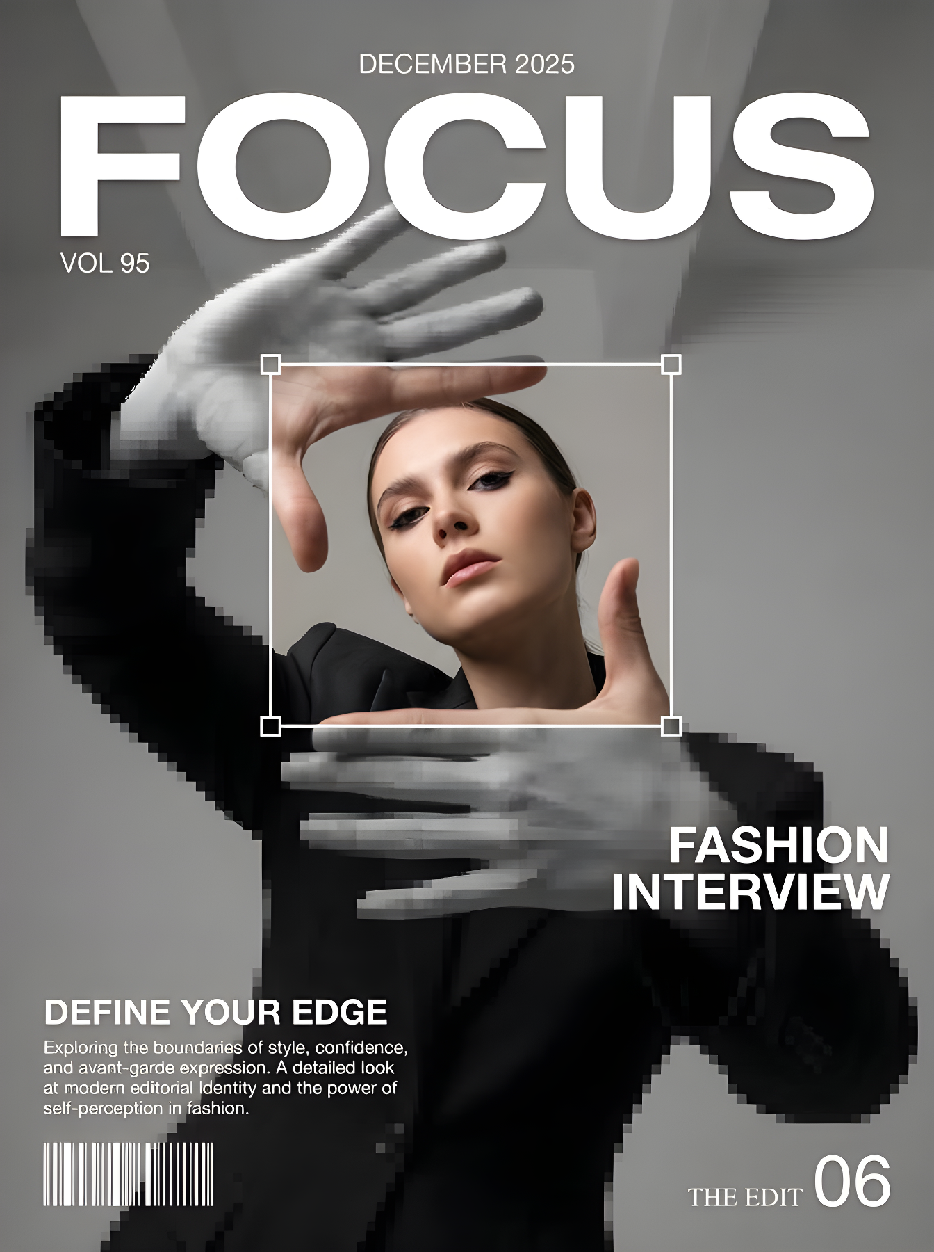 CopyA high-end fashion magazine cover. A young female fashion model, confident and avant-garde in demeanor, with strong physical tension, in a dynamic pose, looking directly at the camera. The shot is from a slightly low angle, looking up. The model makes a gesture with her hands as if interacting with a rectangular selection frame that covers her face and shoulders. Visual rule: only the area inside the selection frame is clear and in natural color; the area outside the selection frame is completely grayscale and heavily pixelated, with no color or clear areas. Soft, diffused studio lighting. Modern editorial styling. Layout text: Top center, bold, uppercase, wide sans-serif title "FOCUS", with small text "DECEMBER 2025" above it; bottom left of the title "VOL + random two-digit number"; bottom left corner text block (short, confident fashion headline, short paragraph, barcode); right side "FASHION INTERVIEW"; bottom right corner, small serif "THE EDIT" and large "random number from 01-09". The model overlaps and obscures the title, creating foreground/background relationships with distinct layers, clean and modern. All fonts are white, montage-style typography, creating a strong contrast between text and image.