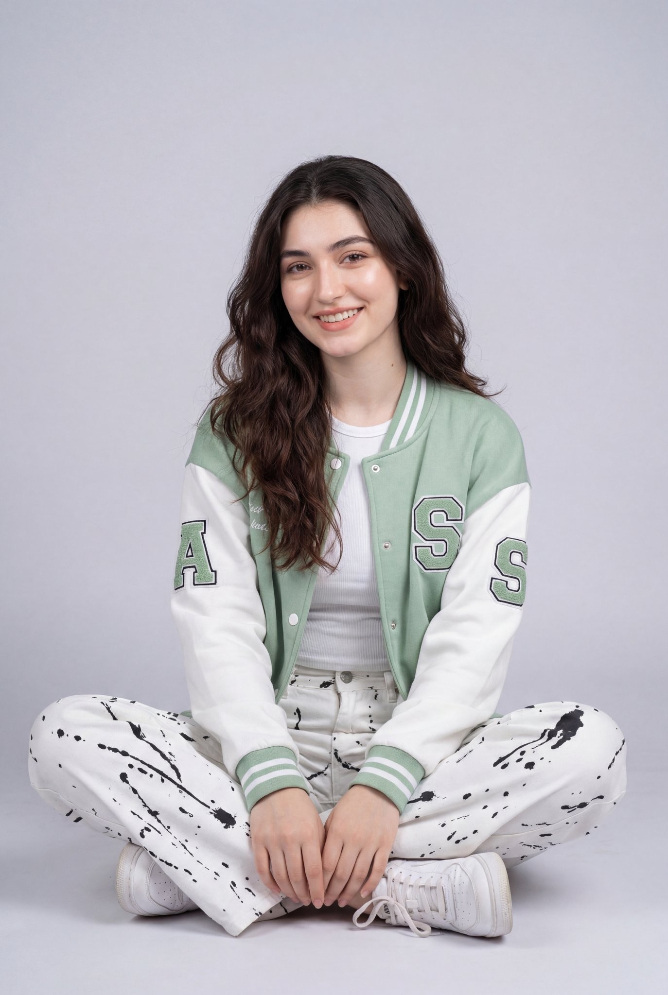 CopyStudio portrait of a smiling young woman with long wavy dark brown hair, sitting cross-legged on a light gray floor against a plain soft gray background, wearing a pastel green and white varsity jacket with letter patches, white fitted t-shirt, loose white pants with abstract black splatter patterns, casual relaxed pose, natural makeup, warm friendly expression, soft even studio lighting, minimal shadows, clean modern aesthetic, high-resolution fashion photography, sharp focus, 85mm lens, professional studio setup, neutral color grading.