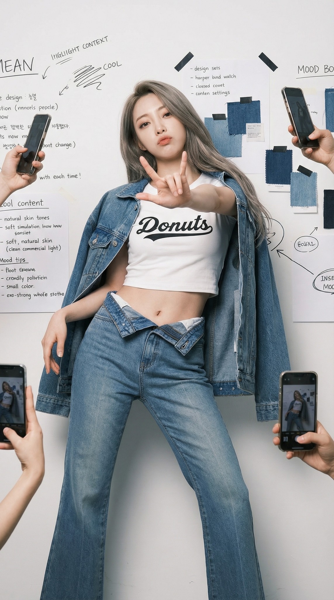 Copy{ "portrait_prompt": { "subject": { "description": "Based on <User Portrait>, a confident young woman with an effortlessly cool expression, making a peace sign towards the camera with her right hand, body slightly angled but facing forward", "features": { "hair": "hair cascading over shoulders", "eyes": "Direct confident gaze at camera", "expression": "Slightly pouty lips, effortlessly cool 'I don't care' vibe — NOT smiling, NOT cold, just unbothered confidence" }, "pose": "Standing with right hand making peace sign extended toward camera, left arm relaxed, denim jacket draped over shoulders like a cape with arms spread" }, "attire": { "type": "Based on user-uploaded clothing reference", "details": [ "Oversized denim jacket worn as cape/draped on shoulders", "White cropped top with black 'Donuts' text" ], "color": "Denim blue + white + black text accents" }, "composition": { "shot_type": "3/4 body (above knees)", "focal_length": "50-70mm standard lens", "aperture": "f/5.6-f/8 (deep depth of field)", "camera_angle": "Slightly low angle (shooting upward to elongate legs)", "camera_height": "Chest to waist level", "framing": "Centered symmetry + Frame within frame: multiple smartphone-holding hands entering from all four edges of frame surrounding the subject; FG=phones/arms, MG=subject centered, BG=graffiti wall", "aspect_ratio": "4:5 (portrait/editorial)" }, "lighting": { "type": "Professional studio softbox lighting", "direction": "Large frontal soft light, even illumination", "mood": "Clean, controlled, flattering — no harsh shadows, skin appears smooth with healthy glow" }, "color_palette": { "film_simulation": "ASTIA (S)", "style": "Fujifilm ASTIA inspired color grading, soft and flattering skin tones, low contrast, gentle highlights, clean commercial look", "tones": ["Denim blue", "Clean white", "Natural warm skin tones", "Black text accents"], "grade_notes": [ "highlight roll-off: soft and controlled", "shadow tint: neutral to slightly cool", "contrast curve: low to medium contrast", "grain: none (clean commercial)" ] }, "environment": { "setting": "Studio with styled editorial backdrop", "background": "White wall covered with black handwritten English text/notes, scribbles, tape pieces, clips, and small denim fabric corners — 'mood board' aesthetic", "atmosphere": "Curated creative chaos, fashion editorial set design" }, "mood": "Confident, empowered, social-media-era cool girl, editorial fashion, Y2K revival", "technical_tags": ["photorealistic", "studio lighting", "deep depth of field", "commercial photography", "fashion editorial"], "character_reference": "Based on user-uploaded character reference", "clothing_reference": "Based on user-uploaded clothing reference", "negative_prompt": "Harsh shadows, hard flash, shallow depth of field, grainy, lo-fi, casual snapshot, soft focus, overexposed, uneven lighting, distorted perspective" } }