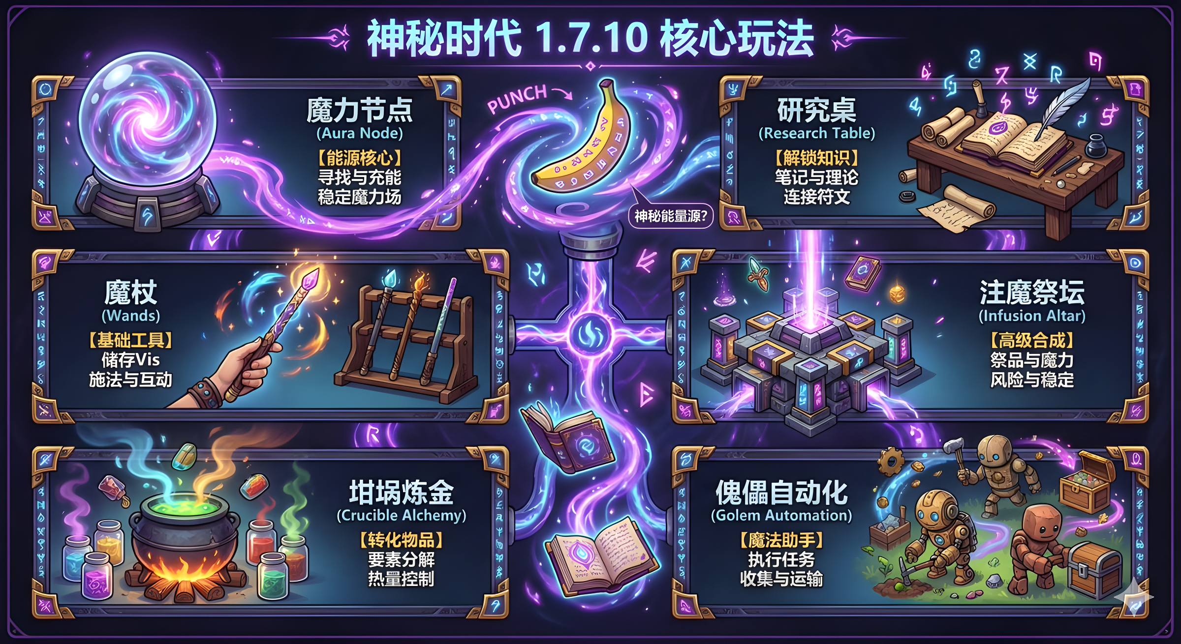CopyCreate a complete infographic in Chinese using a PUNCH layout to display all content on one page! This is a fully designed infographic based on the article content you provided. It may incorporate banana visual elements. To achieve the "PUNCH" effect, I've employed a modular design, distilled core keywords, paired them with visual symbols, and used compact typography to emphasize visual impact and information efficiency. Content: Core gameplay mechanics of Thaumcraft 1.7.10 for Minecraft An illustration showcasing the core gameplay of Thaumcraft 1.7.10 in Minecraft, Featuring mana nodes, research table, wand, infusion altar, crucible alchemy, and golem automation, The scene is filled with arcane runes, purple and blue magical energy, evoking a sense of mystery and classical magical technology style, Including floating spellbooks, Vis flow effects, and detailed depictions of magical devices in operation. High quality, intricate textures, glowing effects, fantasy style.