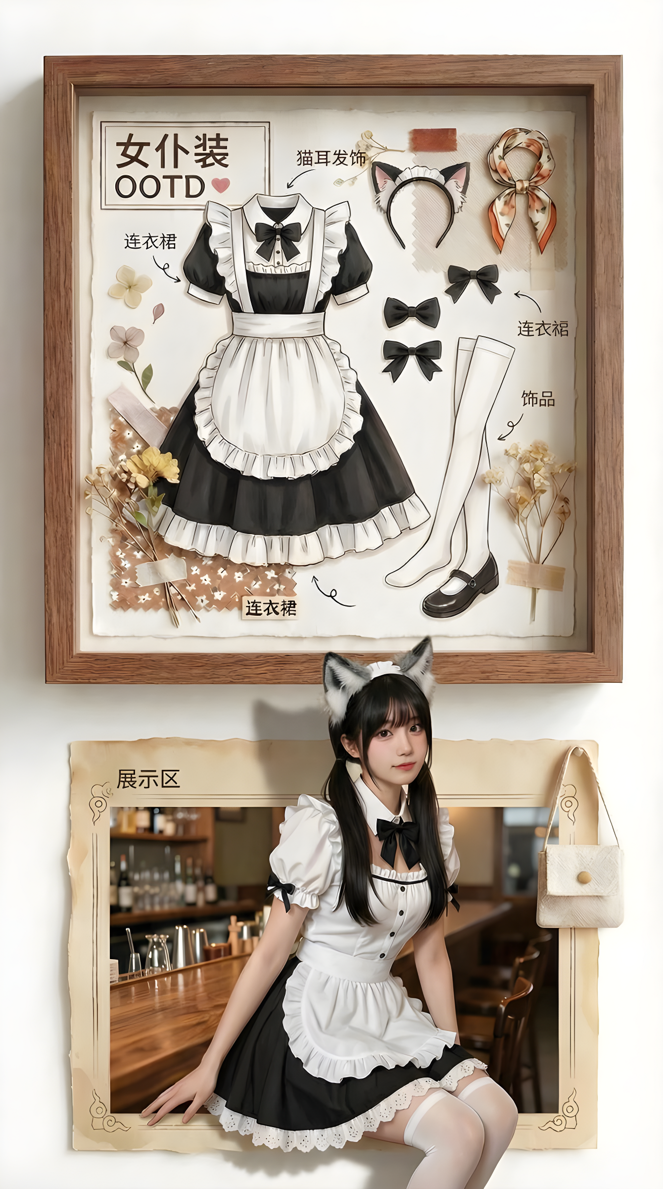CopyA vertical split-screen creative product photography composition on a clean white wall background. High-resolution, photorealistic, commercial advertisement quality. Top Section: The Specimen Box The upper half features an exquisite light oak wooden shadow box frame mounted on the wall. Inside, a specific outfit is displayed as an artistic flat-lay museum specimen: [Insert Clothing Details Here, e.g., a sleek black satin slip dress with delicate lace trim and thin spaghetti straps]. The garments are neatly pinned in place. Surrounding them are small thematic decorative props: [Insert Props, e.g., dried roses, vintage perfume bottles, silk ribbon]. Elegant calligraphy on the matte paper backdrop reads: [Insert Text, e.g., "Midnight Elegance" or "Silk & Secrets"]. Soft studio lighting accentuates the rich texture and drape of the fabric. Bottom Section: Naked-Eye 3D Reality The lower half creates a hyperrealistic "naked-eye 3D" illusion. A rectangular picture-frame border sits directly beneath the top box. A stunningly realistic young woman [Insert Model Description, e.g., a poised East Asian model with long wavy black hair, subtle smoky eyes, and a confident gaze] wears the exact same outfit as shown above. She lounges casually on the bottom edge of the frame—one leg bent with foot resting inside the frame, the other leg elegantly dangling out into the viewer’s space. Her torso leans back slightly, elbow resting on her raised knee, fingers lightly grazing the fabric near her collarbone. Her body forms a soft, sensual S-curve that highlights the garment’s silhouette without overt exposure. She looks directly at the camera with a calm, knowing smile—inviting yet enigmatic. This dynamic, lifelike pose contrasts powerfully with the static, archival display above, creating visual tension between reality and presentation. Technical Specs: Soft natural shadows, ambient occlusion, bright and airy yet cinematic lighting, 8K resolution, Octane Render, vivid but refined color palette, ultra-detailed fabric textures (satin sheen, lace transparency, stitching), shallow depth of field, Vogue editorial style, filmic grain, professional fashion photography. Negative Prompt (recommended): blurry, low-res, distorted anatomy, extra limbs, deformed hands, cartoon, anime, doll-like, plastic skin, overexposed, cluttered background, text errors, mismatched clothing, floating objects, unrealistic proportions. 参考人物,想看老师制服