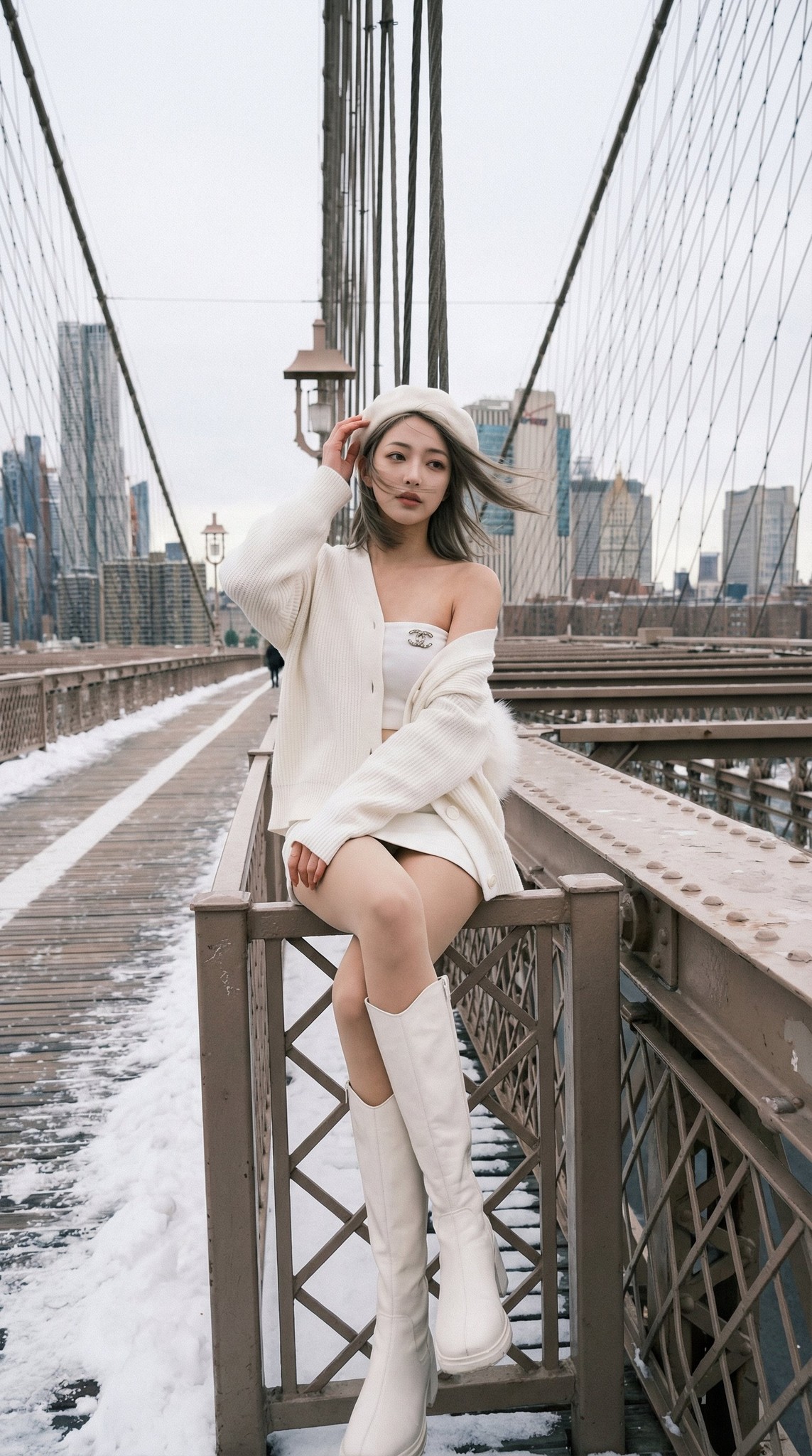 Copy{ "portrait_prompt": { "subject": { "description": "Based on <User Portrait>, a young woman with confident and composed expression, sitting on the metal railing of Brooklyn Bridge, one hand raised to hold a white wool beret on her head, long dark wavy hair flowing dramatically in the winter wind", "features": { "hair": "Long black wavy hair, center-parted, blowing freely to the right in the wind, reaching past chest", "eyes": "Looking directly at camera with calm confidence", "expression": "Poised, slightly playful, effortlessly elegant" }, "pose": "Based on user-uploaded pose reference" }, "attire": { "type": "All-white winter ensemble with layered textures", "details": [ "White oversized chunky knit cardigan worn off-shoulder, draped loosely revealing collarbone and shoulders", "White strapless tube top underneath with a small gold/dark brooch pin at center chest", "White high-waisted mini skirt, clean A-line cut", "Nude sheer tights / flesh-tone stockings creating seamless skin-tone transition between skirt and boots", "White knee-high pointed-toe leather boots with block heel", "White wool beret tilted slightly on head", "Delicate pearl drop earrings", "Fine gold chain necklace" ], "color": "Head-to-toe crisp white with nude hosiery as the only warm break" }, "composition": { "shot_type": "Medium shot / Full body", "focal_length": "58mm equivalent, natural perspective", "aperture": "f/2.8 — subject sharp, background softly rendered but recognizable", "camera_angle": "Slightly below eye-level, camera at chest height of seated subject", "camera_height": "Chest-level (subject is elevated on railing)", "framing": "Leading lines composition — bridge walkway railings converge toward stone tower behind subject; subject centered slightly right of frame; FG: metal railing + snow-dusted wooden planks; MG: subject on railing; BG: Gothic stone tower with American flag + suspension cables + distant skyline + broken clouds", "aspect_ratio": "4:5 (portrait / social media optimized)" }, "lighting": { "type": "Natural overcast daylight with cloud breaks, soft diffused illumination", "direction": "Front-left, broad and even across subject; white clothing acts as natural fill reflector", "mood": "Clean, bright, winter-crisp — no dramatic shadows, emphasis on clarity and freshness" }, "color_palette": { "film_simulation": "REALA ACE (RA)", "style": "Fujifilm REALA ACE inspired color grading, clean modern realism, natural yet slightly vivid colors, accurate skin tones, refined highlights, neutral whites, subtle fine grain", "tones": [ "Crisp pure white (clothing, no yellow cast)", "Warm natural skin tone through nude hosiery", "Industrial rust-brown and dark iron (bridge railings and structure)", "Blue-gray overcast sky with warm cloud highlights" ], "grade_notes": [ "highlight roll-off: gentle, whites retain detail without blowout", "shadow tint: neutral to very slightly warm", "contrast curve: medium — enough punch to separate white outfit from sky, not harsh", "grain: subtle fine grain, barely perceptible", "skin: warm and natural through sheer stockings, not orange" ] }, "environment": { "setting": "Brooklyn Bridge pedestrian walkway, New York City, winter season", "background": "Iconic Gothic stone tower with American flag on top, steel suspension cables fanning symmetrically, patches of snow on wooden plank walkway, faint Manhattan skyline in distance", "atmosphere": "Winter clarity — cold crisp air, scattered snow, dramatic cloud formations with patches of blue sky, wind visible through hair movement" }, "mood": "Confident winter elegance, urban sophistication meets effortless cool, aspirational city-girl energy on an iconic landmark", "technical_tags": [ "photorealistic", "natural daylight", "shallow to medium depth of field", "subtle fine grain", "sharp on subject", "wind-blown hair motion" ], "character_reference": "Based on user-uploaded character reference", "pose_reference": "Based on user-uploaded pose reference — seated on metal bridge railing, right hand raised holding beret, left hand resting on railing, legs together angled slightly to one side, boots visible below knee", "negative_prompt": "heavy vintage fade, strong retro cast, teal-orange, oversaturation, harsh sharpening, HDR sheen, flash photography, hard shadows, indoor lighting, blurry face, unnatural skin, plastic texture, over-processed" } }