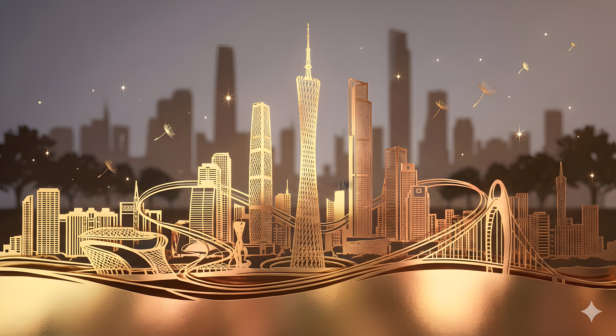 Copy以珠江新城现代都市景观为灵感的剪纸艺术,通过精巧的镂空手法在一整幅纸上,立体刻画广州塔、东西双塔等地标建筑与繁华城景。所有建筑与元素均以流畅的线条与结构相连,无孤立部分,构成一幅完整的都市画卷。 画面采用金属箔或光泽纸材质,表面带有细腻的明暗光泽,在光照下呈现柔和的高光与阴影,仿佛被城市灯光轻轻照亮。背景以虚化的珠江新城天际线为衬,点缀隐约可见的花城广场与树木轮廓,整体透出现代浪漫的氛围。 作品中巧妙融入轻盈的蒲公英绒毛或星光般的动态光点,象征梦想与活力在这座新城中飘散飞扬。整体呈现8K超高清视觉,细节丰富,真实而富有艺术感染力。