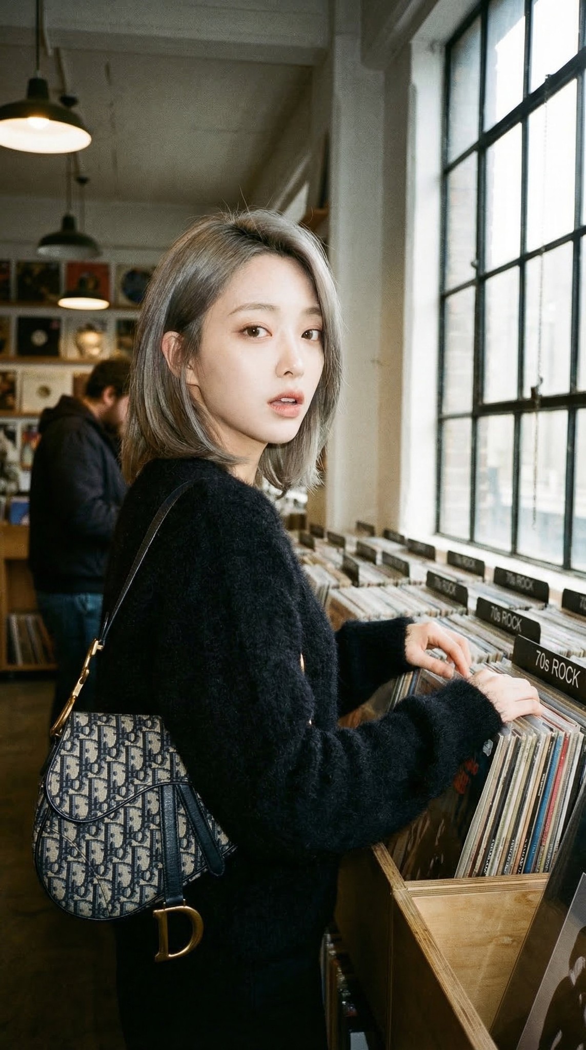 Copy{ "portrait_prompt": { "subject": { "description": "Based on <User Portrait>, a young woman browsing vinyl records in an independent record store, body facing RIGHT toward the record bins, head turned LEFT over her shoulder looking back at camera — captured in the exact 0.5-second moment of turning around", "features": { "hair": "hair, natural waves, flowing over shoulders, catching mixed warm-cool light creating split-tone highlights", "eyes": "Mid-turn eye contact, slightly widened", "expression": "Micro-surprise at being photographed, lips slightly parted" }, "pose": "Body twisted — torso facing right toward record bins, head rotated left to look over left shoulder at camera. Right hand mid-action flipping through vinyl records." }, "attire": { "type": "All-black cool girl layering — fuzzy knit + leather + vintage luxury bag", "details": ["Black mohair / angora fuzzy crew-neck sweater — visibly fluffy texture with soft halo of fibers catching backlight", "Black leather pants — matte black leather with subtle creasing at the hip", "LEFT SHOULDER: Christian Dior Saddle Bag — vintage style in dark leather, gold-tone Christian Dior lettering on the front strap hardware"] }, "composition": { "shot_type": "Medium close-up — from mid-chest to top of head, with right hand and vinyl records visible in lower right", "focal_length": "40-50mm", "aperture": "f/2.0-2.8", "camera_angle": "Eye level, straight on", "aspect_ratio": "4:5" }, "lighting": { "type": "Mixed color temperature ambient — cold daylight from window + warm tungsten from interior track lighting", "direction": "PRIMARY: large industrial grid window on camera-right providing soft cold daylight. SECONDARY: overhead track spotlights providing warm tungsten fill", "mood": "Uncorrected mixed lighting — face has SPLIT COLOR TEMPERATURE, right side cool blue-white, left side warm amber-yellow" }, "color_palette": { "film_simulation": "Classic Negative (CN)", "style": "Fujifilm Classic Negative inspired color grading — shadows tinted with cyan/teal, highlights retain warmth from tungsten lights, overall saturation pulled back 15-20%" }, "environment": { "setting": "Independent vinyl record store — wooden browse bins, hand-written category dividers, industrial ceiling with exposed track lighting, large factory-style grid windows" }, "mood": "Caught in the act of being herself — browsing 70s rock vinyl in head-to-toe black with a Dior bag, someone pointed a camera at her at the exact right moment", "technical_tags": ["photorealistic", "natural mixed lighting", "uncorrected white balance", "cold warm split", "candid moment", "film grain", "record store", "mohair texture backlit", "snapshot aesthetic"] } }