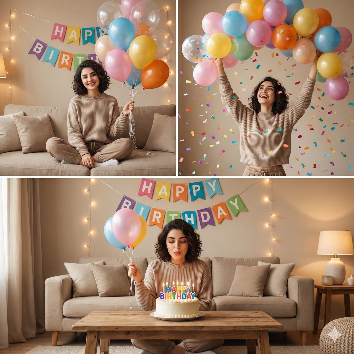 CopyA cozy indoor birthday celebration collage featuring the same woman in multiple moments. Warm, soft-lit living room with neutral beige tones. Colorful “HAPPY BIRTHDAY” decorative banner hanging on the wall as party décor. In one frame, she sits cross-legged on a couch holding transparent confetti balloons and solid color balloons, smiling warmly. In another frame, she raises a large arch of colorful balloons above her head, celebrating joyfully as confetti falls. In another frame, she sits on the couch blowing out candles on a birthday cake placed on a wooden coffee table in front of her, holding balloons in one hand. Casual cozy outfit, natural expressions, realistic skin tones, warm ambient lighting, festive yet intimate home celebration mood, lifestyle photography style, clean composition, ultra-realistic, 1:1 aspect ratio.