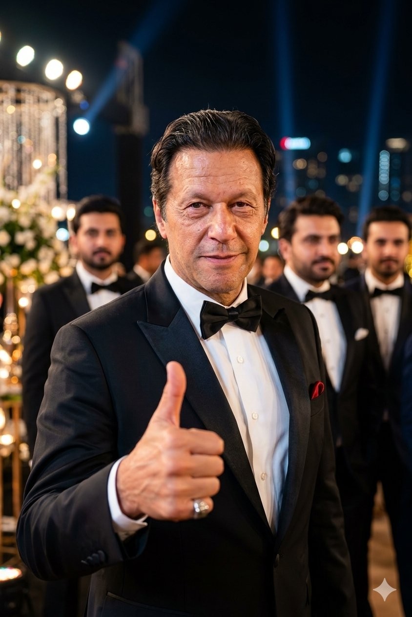 CopyA handsome middle-aged South Asian man in his late 50s, looking like Imran Khan, with salt-and-pepper neatly combed hair, sharp facial features, slight smile, giving a confident thumbs-up gesture with his right hand, wearing a perfectly tailored black tuxedo with satin lapels, white dress shirt, black bow tie, and a red pocket square, silver ring on his right hand, standing at a luxurious formal evening event at night. Background: elegant outdoor night setting with blurred bokeh lights, city skyline lights in the distance, blue spotlight beams, a large sparkling crystal chandelier with white floral arrangements on the left side. Three younger men in black tuxedos and bow ties standing behind him, slightly out of focus. Cinematic lighting, dramatic yet warm ambiance, high-end gala atmosphere, realistic photography, sharp focus on the main subject, shallow depth of field, professional portrait style, 8k quality.