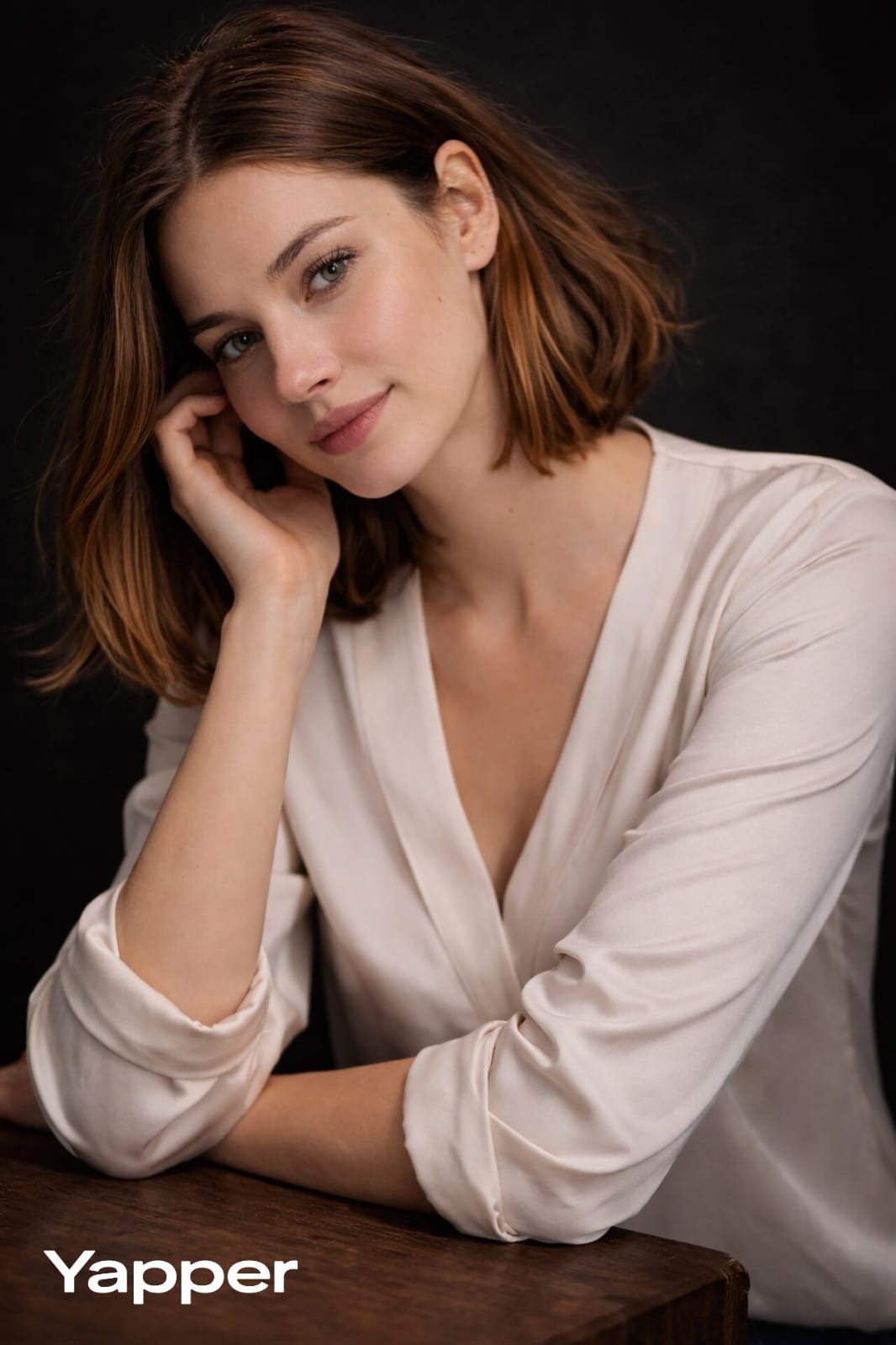 Copy{ "scene": "cinematic color studio portrait", "reference": { "identity_match": "match the uploaded reference face precisely", "facial_accuracy": [ "bone structure", "eye shape", "nose proportions", "jawline", "facial symmetry", "hairline" ], "skin_texture": "natural pores and realistic skin detail" }, "subject": { "type": "woman", "age": "around 25", "expression": "calm, confident, introspective", "gaze": "direct eye contact with camera" }, "pose": { "style": "thoughtful", "description": "head slightly angled with one hand gently resting on chin" }, "hair": { "style": "same hairstyle as reference, natural volume with visible strands" }, "lighting": { "style": "soft cinematic studio lighting", "key_light": "above eye level from viewer's left", "effect": "soft highlights on forehead, nose bridge, and cheekbones", "rim_light": "subtle separation light on hair and shoulders" }, "composition": { "orientation": "vertical portrait", "aspect_ratio": "4:5", "crop": "tight head and shoulders", "focus": "sharp focus on eyes" }, "background": "dark neutral studio background", "color": { "style": "natural cinematic color grading", "tones": "balanced skin tones, soft highlights, rich shadows" }, "quality": { "resolution": "8K", "style": "editorial studio photography", "detail": "ultra-realistic, shallow depth of field" } }