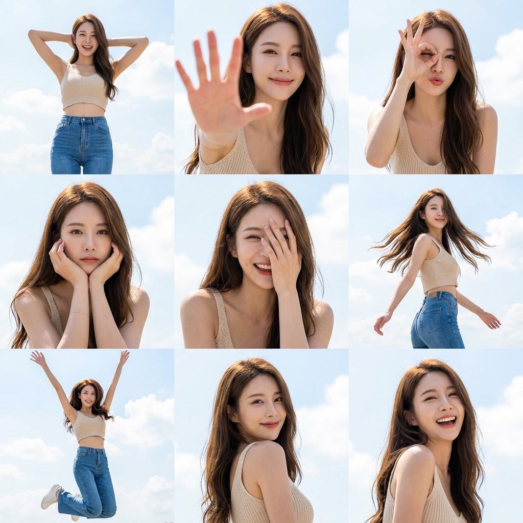 Copy{ "Objective": "Create a 3x3 grid photo collage of nine dynamic poses of a female subject with sunny sky aesthetics", "FaceReference": { "Mode": "Strict face preservation", "Instruction": "Use uploaded reference for exact facial features", "Consistency": "Face identical across all nine frames" }, "GridComposition": { "Layout": "3x3 grid", "FocalLengthMix": "35mm full-body to 85mm close-ups", "PoseVariety": ["Wide stance hands behind head", "Palm extended toward camera", "OK gesture over eye playful", "Chin resting in both hands", "Half face covered by hand", "Twirling with hair flowing", "Jumping with arms up", "Looking over shoulder", "Candid laughing"] }, "PersonaDetails": { "Subject": { "Type": "Same as reference", "Wardrobe": "Light beige knit crop top, high-waisted blue jeans, delicate gold necklace", "OverallPresence": "Confident, radiant, approachable" } }, "Environment": { "Setting": "Outdoor open sky", "Background": "Vibrant azure sky with clouds", "Lighting": { "Style": "Harsh high-key natural sunlight", "Quality": "Crisp defined shadows" } }, "ImageQuality": { "Resolution": "8K hyper-realistic", "Aesthetic": "High-end lifestyle campaign" } }