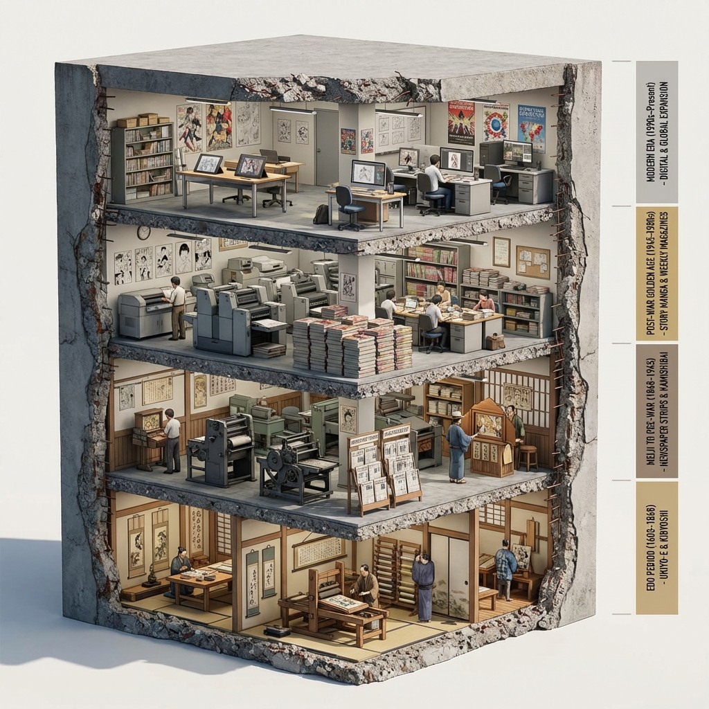 CopyEvolution of Manga --> A single chunky block (like a museum cutaway) sliced to reveal 4 stacked floors/strata. Each level represents an era/stage/version inferred from INPUT. Right side: a vertical legend bar with dates/period labels inferred by the model. Infer 4 major phases and depict each with representative artifacts, tools, and environments. Keep transitions educational: show what changed between levels (materials, scale, method). Architectural section realism: visible thickness, rebar/fasteners if applicable, realistic debris at cut edge.