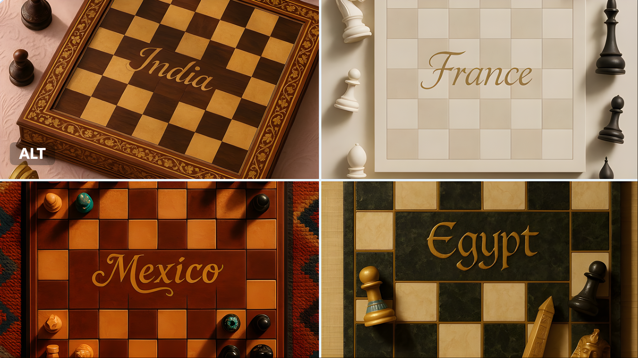 CopyA highly realistic vertical photograph of a traditional chessboard viewed from above, set against a textured surface inspired by [COUNTRY]’s artistic heritage. The chessboard features intricate patterns and national motifs, with the word “[COUNTRY]” written across the board in elegant golden calligraphy. All the chess pieces are off the board, arranged around it on the fabric — some lying on their side, others upright — as if waiting to be placed. Each piece is uniquely reimagined in shape, ornament, and texture, reflecting the architecture, cultural symbols, and color palette of [COUNTRY]. Rich materials, soft directional light, cinematic shadows, ultra-detailed editorial still life style, symmetrical top-down framing, 9:16 format.