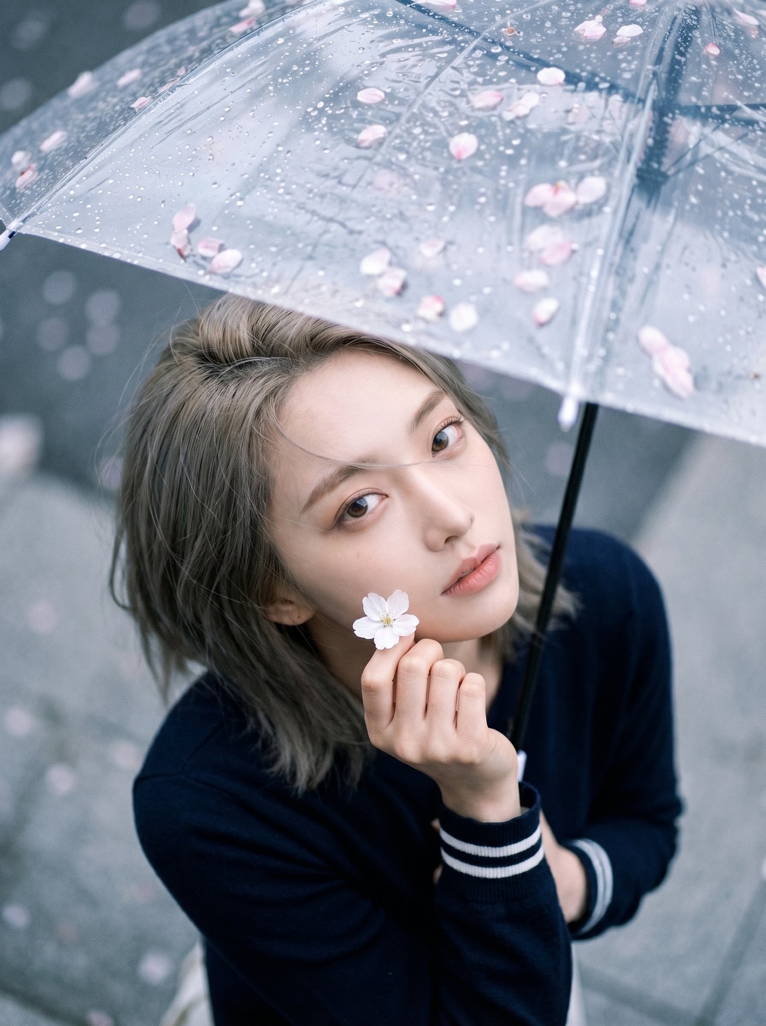 Copy{ "portrait_prompt": { "subject": { "description": "Based on <User Portrait>, a young woman with soft fair skin, delicate facial features, large glossy eyes, airy wispy bangs, and dark slightly tousled hair, rendered in a dreamy rainy-day portrait style.", "features": { "hair": "dark brown to black hair, soft loose texture, airy see-through bangs, slightly tousled around the forehead and cheeks", "eyes": "large moist-looking eyes gazing upward through the umbrella, soft catchlights, gentle and slightly wistful", "expression": "quiet, dreamy, tender, slightly melancholic, soft pink blush across the cheeks" }, "pose": "close-up portrait from above, the subject is tucked under a transparent umbrella and looks upward toward the camera through the wet umbrella surface, head slightly tilted, one hand raised near the cheek while delicately holding a small white blossom, shoulders relaxed and folded inward" }, "attire": { "type": "dark navy to black long-sleeve top or light jacket", "details": [ "deep navy or black fabric with a soft matte texture", "white double-stripe trim at the cuff", "minimal visible styling because the umbrella and face dominate the frame" ], "color": "deep navy-black with small white cuff accents" }, "composition": { "shot_type": "Close-up", "focal_length": "28-35mm equivalent", "aperture": "smartphone-like deep focus with soft natural diffusion", "camera_angle": "high angle, top-down", "camera_height": "above head", "framing": "the transparent umbrella fills almost the entire frame as a foreground layer, curved umbrella ribs create arcs across the image, the subject's face sits slightly right of center and low-mid frame, flower petals and raindrops are scattered across the umbrella surface, with the hand and blossom entering from the lower right", "aspect_ratio": "3:4" }, "lighting": { "type": "soft overcast rainy daylight filtered through a clear umbrella", "direction": "diffused ambient light from above and front, softened by clouds and the transparent umbrella surface, with no hard shadow edges", "mood": "misty, intimate, quiet, spring-rain softness" }, "color_palette": { "film_simulation": "Fujifilm Pro 400H inspired rainy pastel grading", "style": "cool-neutral rainy editorial tones with pale pink petals, translucent gray highlights, soft blush skin, and gently lifted blacks", "tones": [ "soft rainy gray", "translucent clear silver", "pale pink petals", "deep charcoal-navy clothing", "delicate rosy skin tones" ], "grade_notes": [ "highlight roll-off: soft and milky on the wet transparent umbrella", "shadow tint: neutral-cool with slightly lifted blacks", "contrast curve: low to medium contrast, soft and airy rather than punchy", "saturation: restrained overall, with selective soft pink in petals and blush", "grain: minimal to very subtle, clean smartphone editorial finish" ] }, "environment": { "setting": "outdoor rainy spring street scene viewed almost entirely through a transparent umbrella", "background": "the environment is mostly obscured by the umbrella, raindrops, and shallow urban gray shapes beneath, with only faint hints of the ground and nearby objects visible", "atmosphere": "wet, delicate, romantic, slightly melancholic, intimate" }, "mood": "dreamy rainy-day portrait, intimate, soft, poetic, delicate spring melancholy", "technical_tags": [ "photorealistic", "top-down portrait", "through transparent umbrella", "raindrops on umbrella", "flower petals on umbrella", "soft overcast daylight", "dreamy rainy aesthetic", "smartphone editorial realism", "high detail water droplets", "soft skin texture" ], "character_reference": "Based on user-uploaded character reference", "clothing_reference": "Not required; keep the dark navy-black top with white striped cuffs described above unless a matching clothing reference is provided", "negative_prompt": "opaque umbrella, colored umbrella, dry umbrella, no raindrops, no flower petals, side angle shot, eye-level shot, low angle shot, hard flash, studio lighting, sunny weather, warm golden-hour lighting, heavy HDR, oversaturated colors, sharp commercial beauty retouching, plastic skin, distorted face through extreme refraction, broken fingers, broken hand, messy anatomy, stiff pose, random background clutter, strong bokeh, low-resolution eyes, text, watermark, logo" } }
