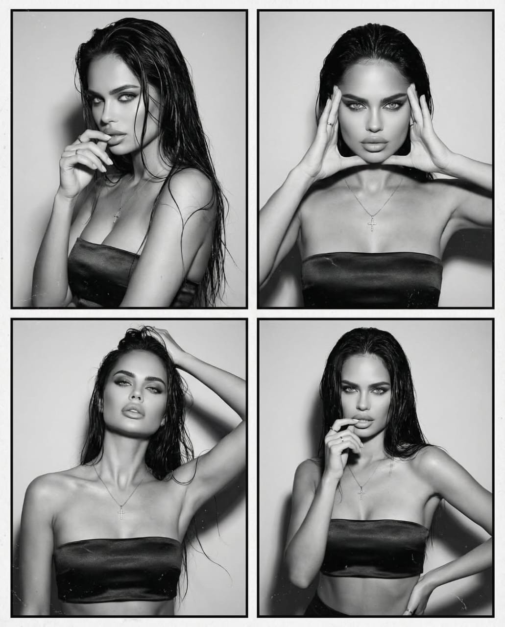 CopyHigh-fashion black and white editorial photo collage featuring a glamorous young woman with wet, slicked-back dark hair. Four separate portrait frames arranged in a clean grid layout, each frame showing a different confident pose and facial expression. The model is wearing a minimal black strapless bandeau top with subtle jewelry, including a delicate cross necklace. Strong eye contact, sculpted cheekbones, full lips. Dramatic high-contrast lighting with cinematic shadows. Poses include hands framing the face, fingers near lips, hand in hair, and a relaxed confident stance. Clean studio background, monochrome aesthetic, Vogue-style luxury fashion editorial photography, sharp focus, timeless mood, ultra-realistic, high resolution.