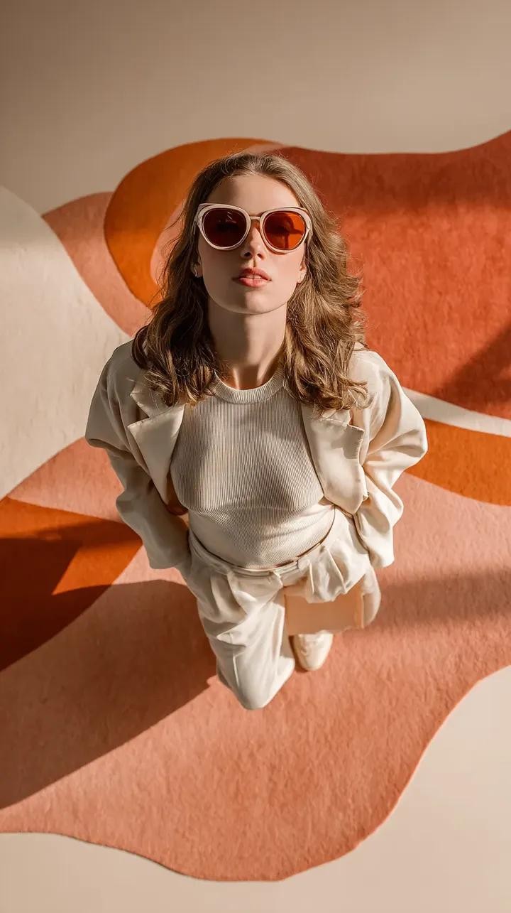 CopyWestern european female model, fair skin, wearing modern stylish sunglasses, full body standing pose, looking up toward camera, high overhead fashion angle, shot from top-down wide perspective, camera placed high above subject, slight wide lens but natural proportions, relaxed confident stance, minimal contemporary outfit in neutral tones, standing on large abstract rug with flowing terracotta and sand organic shapes inspired by sunglass silhouette, seamless clean studio backdrop in warm sand beige tone, no text, no typography, no logo, no graphics, high-end fashion campaign lighting, soft even studio light, natural shadows, clean color grading, premium editorial aesthetic, minimal composition, sunglasses clearly visible and sharp focus, no HDR, no distortion --ar 9:16 --raw