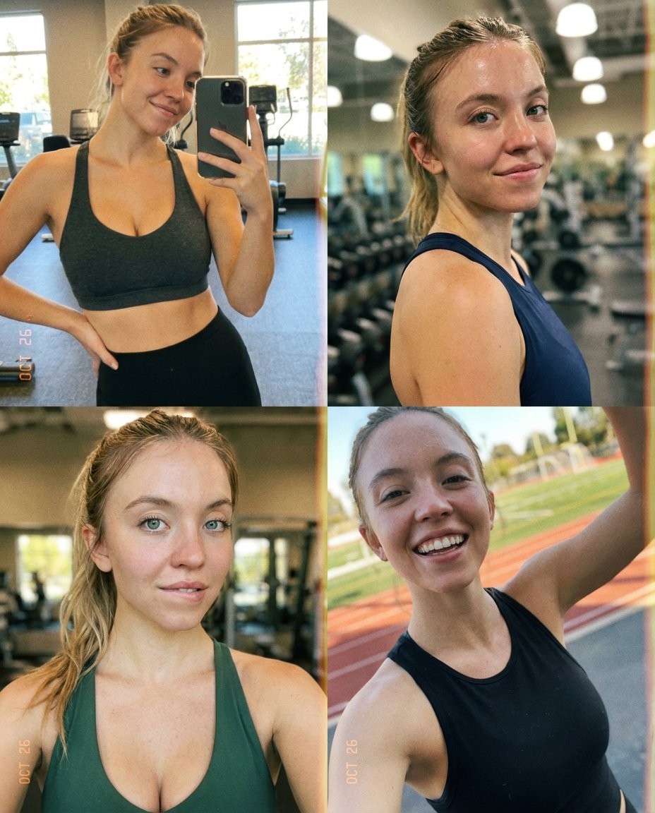 Copy{ "task": "sports_selfie_collage", "output": { "type": "single_image", "layout": "2x2_grid", "aspect_ratio": "4:5", "resolution": "medium_low", "camera_style": "smartphone_front_camera", "image_quality": { "sharpness": "slightly_soft", "noise": "visible_film_grain", "compression_artifacts": true, "dynamic_range": "limited", "white_balance": "slightly_warm" } }, "subject": { "identity": "Sydney Sweeney", "appearance": { "hair": "natural blonde, tied back in a sporty ponytail or loose athletic style", "makeup": "minimal, natural, slightly flushed from activity", "expression": "casual confident smile, candid selfie energy", "skin_texture": "realistic, visible pores, no heavy retouching" }, "outfit": { "type": "sporty", "top": "athletic sports bra or fitted workout top", "bottom": "high-waisted leggings or athletic shorts", "colors": "neutral or soft sporty tones" } }, "poses": { "grid_panels": [ { "panel": "top_left", "pose": "slight upward selfie angle, relaxed smile", "action": "holding phone with one hand, casual posture" }, { "panel": "top_right", "pose": "side-angled selfie, subtle grin", "action": "shoulders turned, natural candid look" }, { "panel": "bottom_left", "pose": "straight-on selfie", "action": "lightly biting lip or soft smile, playful but natural" }, { "panel": "bottom_right", "pose": "slightly downward selfie angle", "action": "laughing or mid-smile, imperfect framing" } ] }, "environment": { "location": "gym or outdoor sports area", "background": "blurred gym equipment or open athletic space", "lighting": { "type": "natural or overhead gym lighting", "quality": "uneven, realistic, non-studio" } }, "photography_style": { "vibe": "casual sports selfie", "lens_simulation": "smartphone wide lens", "depth_of_field": "shallow but inconsistent", "imperfections": [ "slight motion blur", "uneven framing", "minor lens distortion" ] }, "restrictions": { "no_professional_retouching": true, "no_studio_lighting": true, "no_ai_beauty_filters": true, "no_high_end_camera_look": true } }